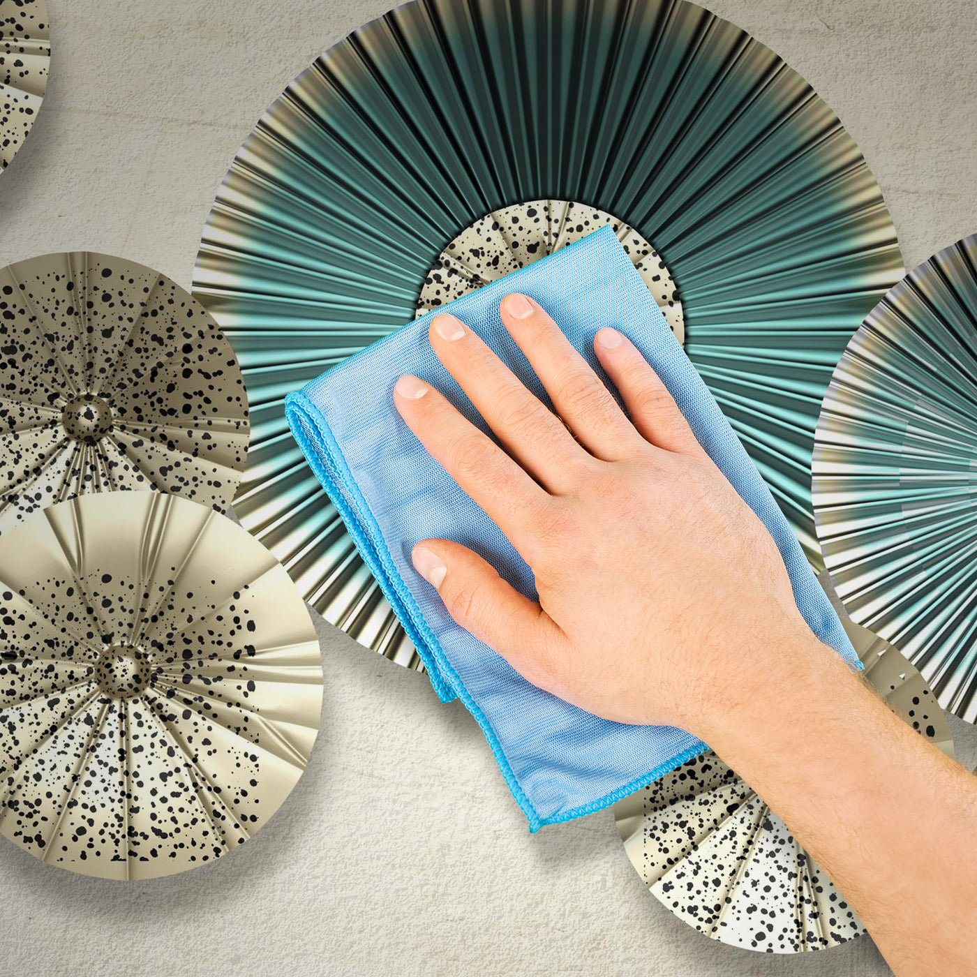 - Reinige eventuelle Verschmutzungen oder Kleberreste sofort mit einem feuchten Schwamm oder Tuch.