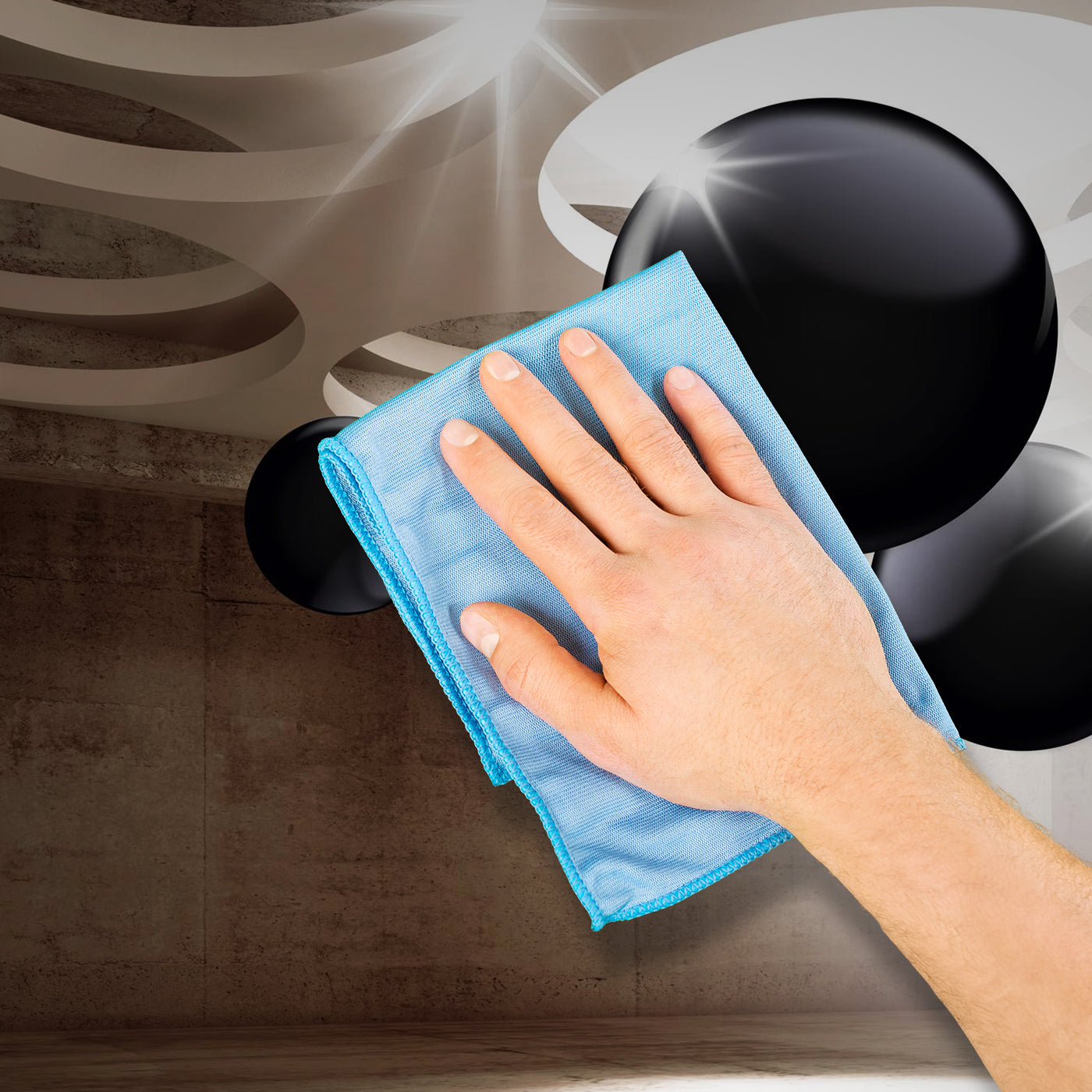 - Reinige eventuelle Verschmutzungen oder Kleberreste sofort mit einem feuchten Schwamm oder Tuch.