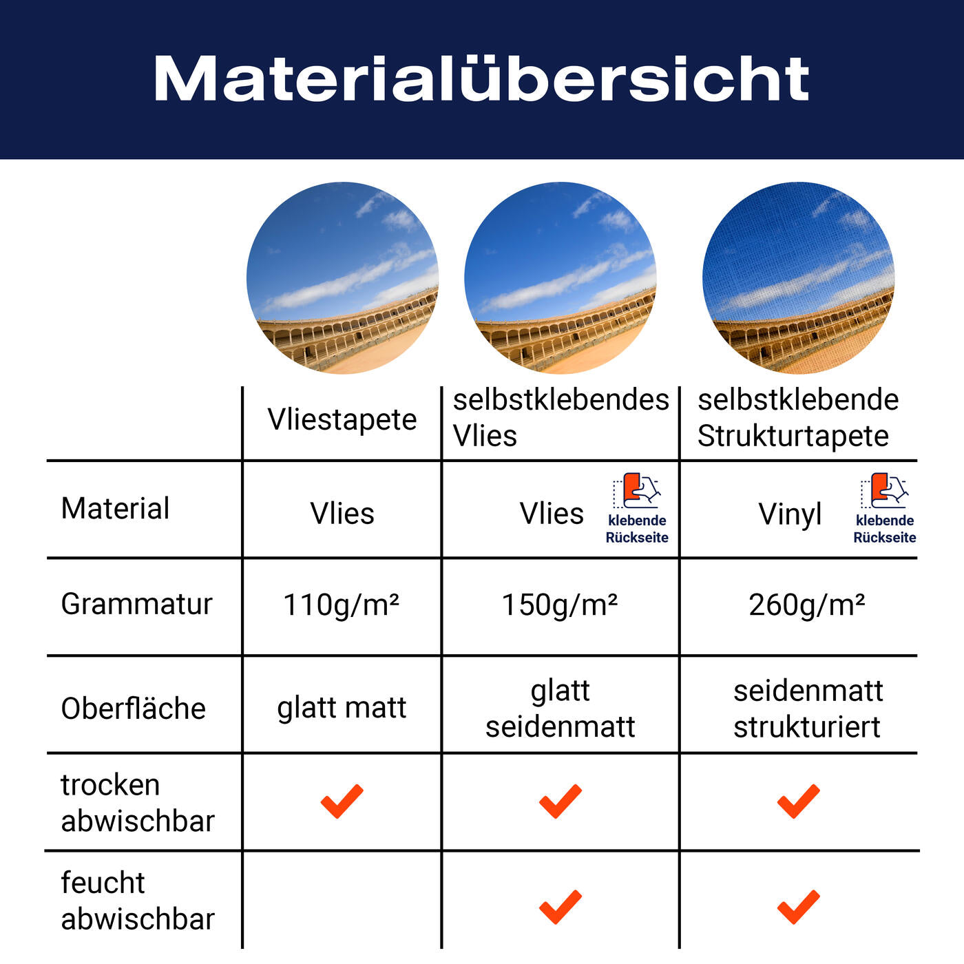 Die Fototapeten sind pflegeleicht und können mit einem feuchten Tuch gereinigt werden, ohne die Farbbrillanz zu beeinträchtigen.