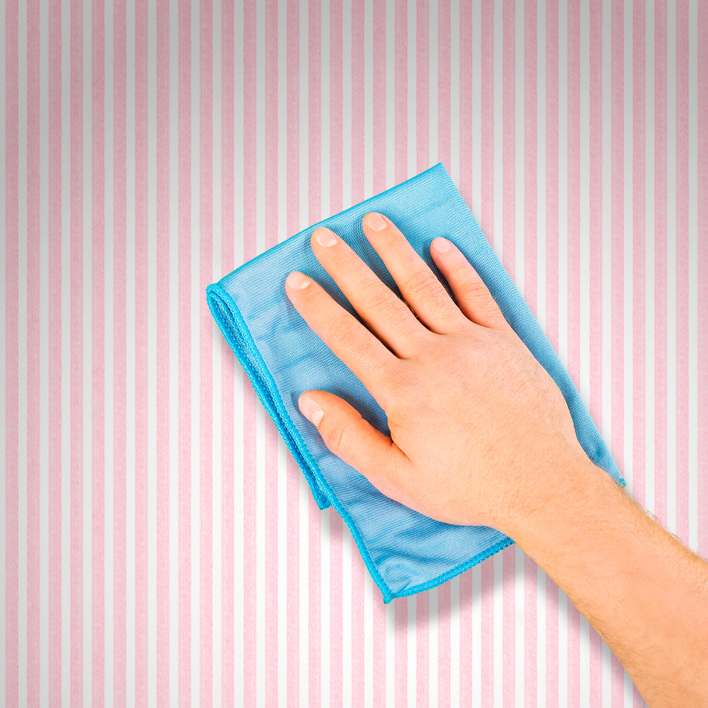 - Reinige eventuelle Verschmutzungen oder Kleberreste sofort mit einem feuchten Schwamm oder Tuch.