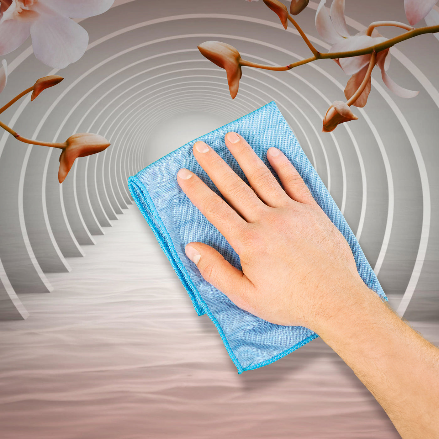 - Reinige eventuelle Verschmutzungen oder Kleberreste sofort mit einem feuchten Schwamm oder Tuch.