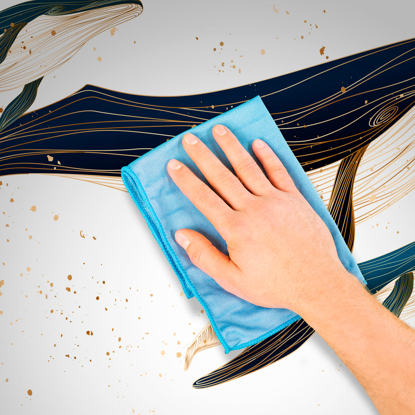 - Reinige eventuelle Verschmutzungen oder Kleberreste sofort mit einem feuchten Schwamm oder Tuch.