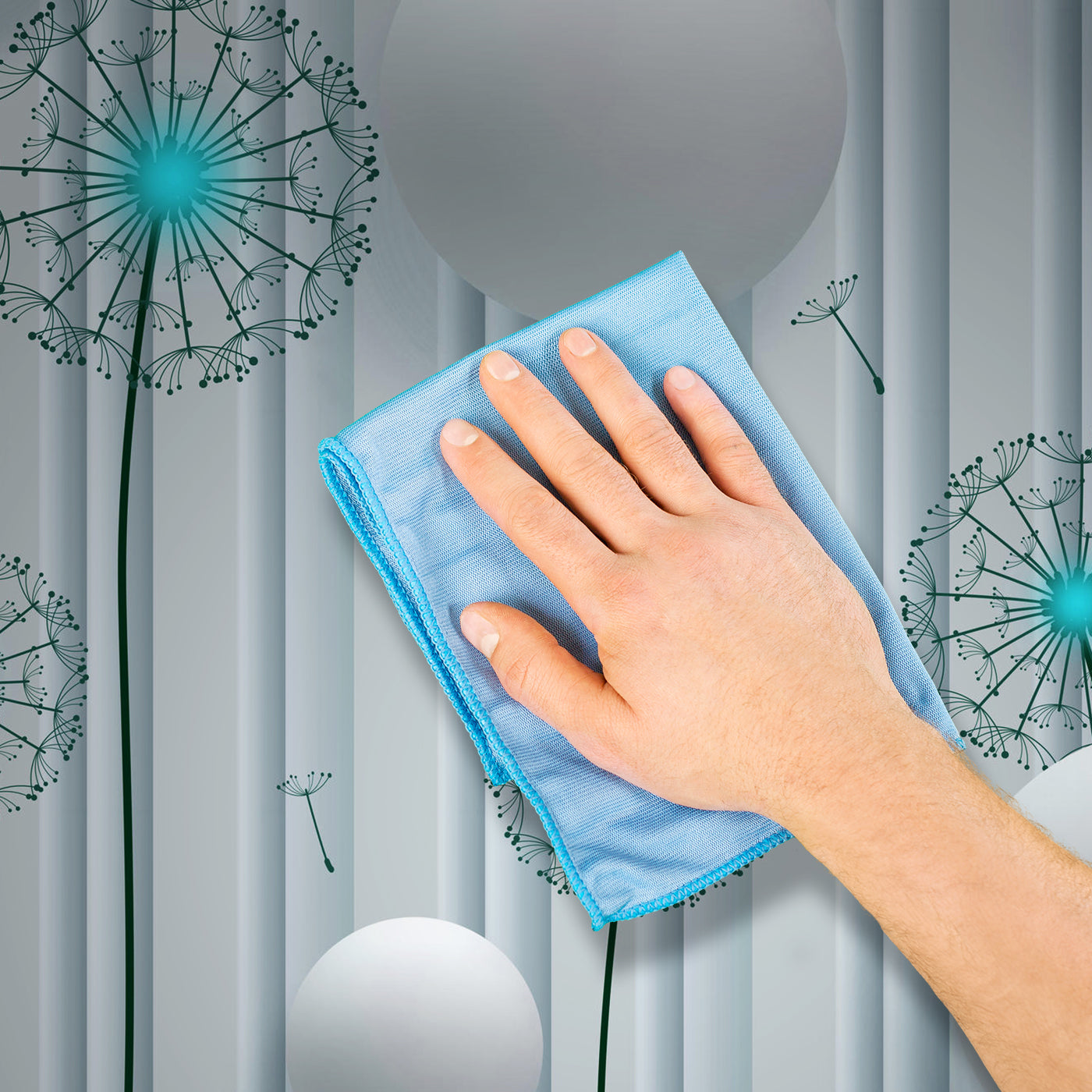 - Reinige eventuelle Verschmutzungen oder Kleberreste sofort mit einem feuchten Schwamm oder Tuch.