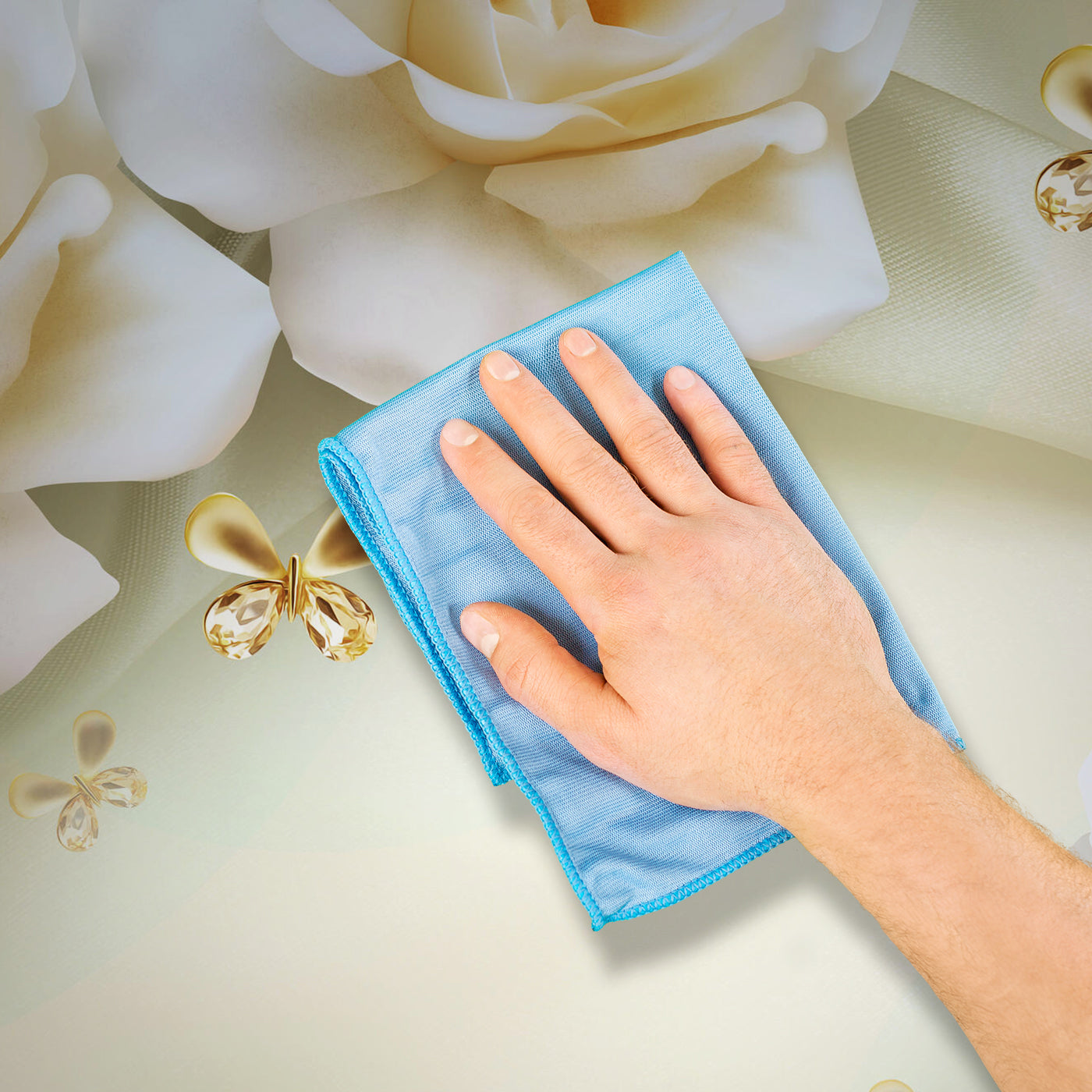 - Reinige eventuelle Verschmutzungen oder Kleberreste sofort mit einem feuchten Schwamm oder Tuch.