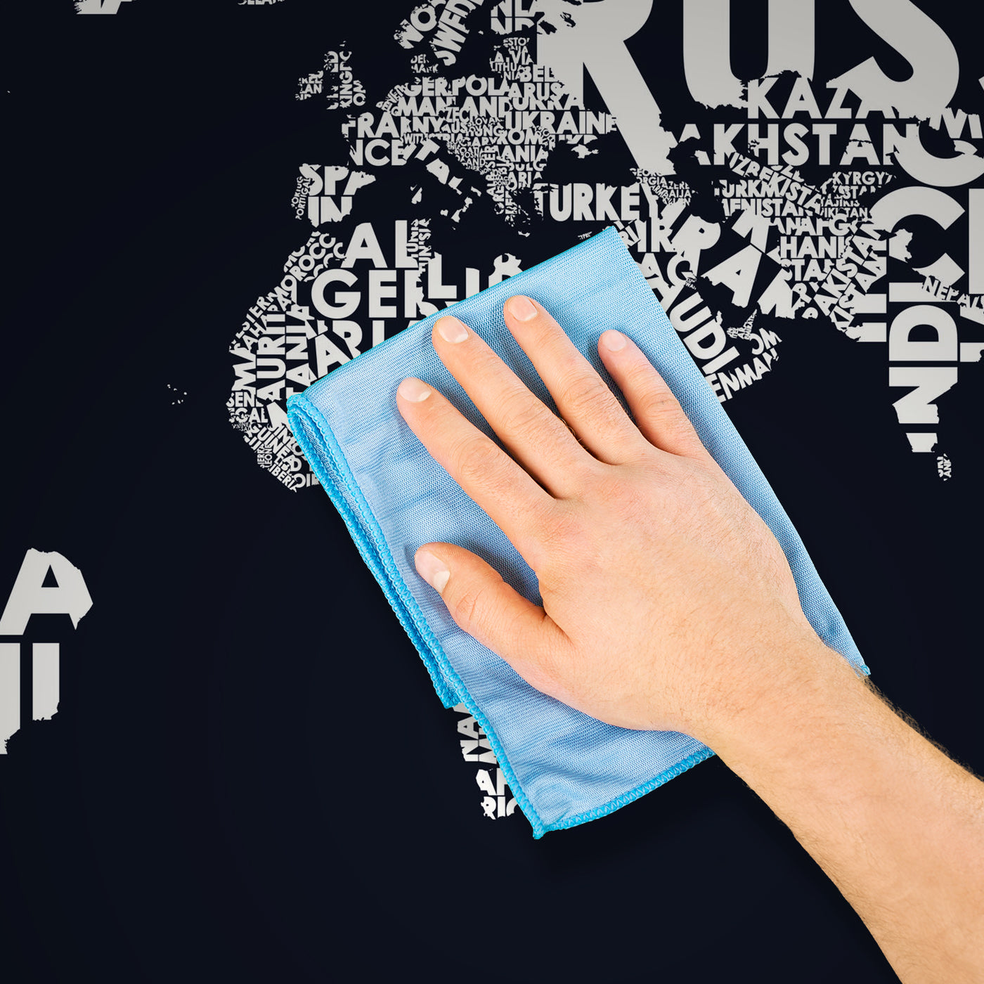 - Reinige eventuelle Verschmutzungen oder Kleberreste sofort mit einem feuchten Schwamm oder Tuch.