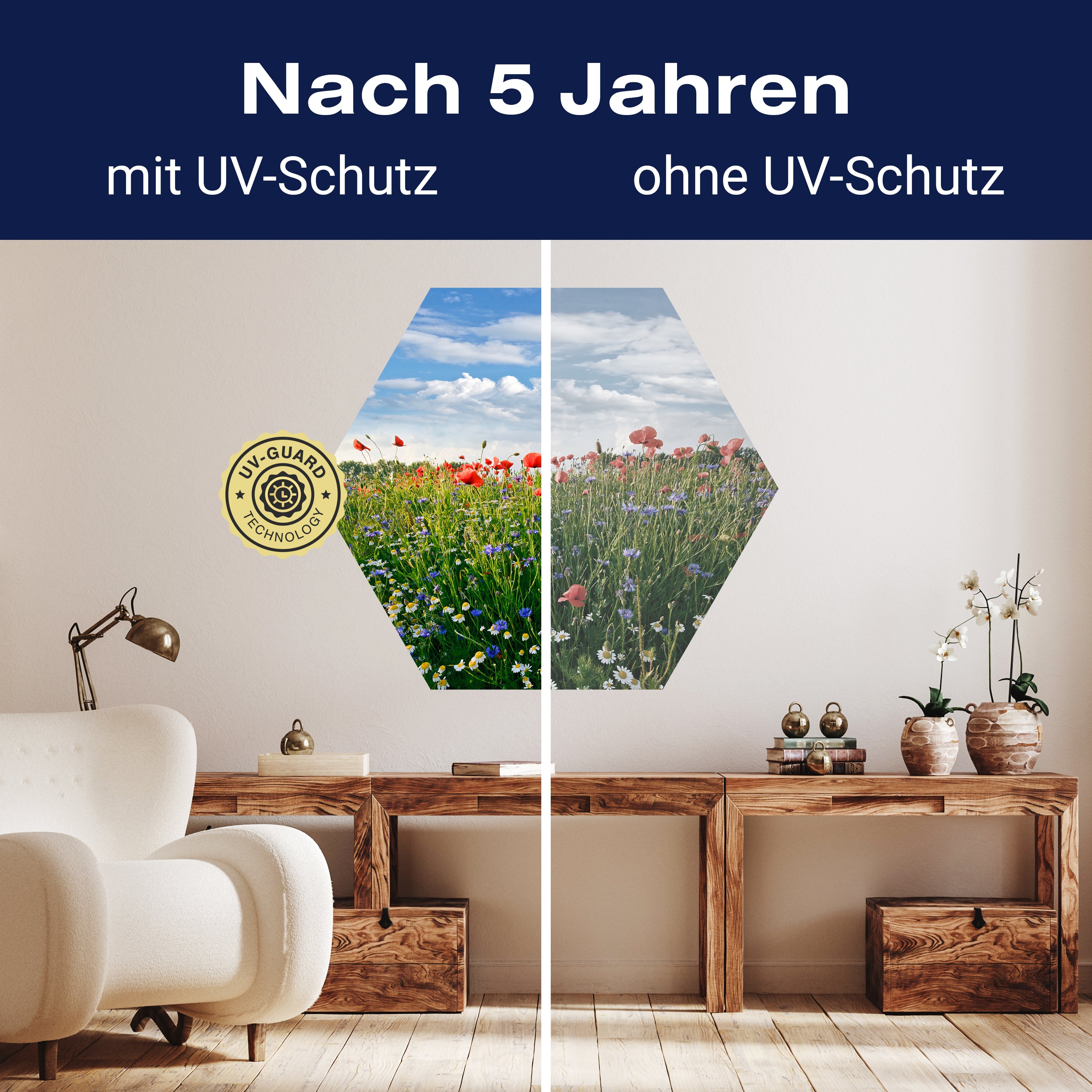 Setze auf die UV-Guard-Technologie, um deine selbstklebenden Panorama-Fototapeten nicht nur atemberaubend, sondern auch dauerhaft strahlend zu gestalten. Dieser fortschrittliche UV-Schutz sorgt dafür, dass die lebhaften Farben und scharfen Details deiner Wandgestaltung gegen die bleichende Wirkung der Sonnenstrahlen geschützt sind. Egal, wie intensiv das Sonnenlicht ist, die UV-Guard-Technologie bewahrt die Brillanz und Tiefe deiner Bilder, sodass sie jahrelang wie neu aussehen. Mach dir keine Sorgen mehr über verblassende Farben oder den Verlust von Detailreichtum. Mit dieser Technologie investierst du in die Langlebigkeit und Schönheit deiner Räume. Steige jetzt um auf UV-Guard und genieße ungetrübte Farbenpracht bei jedem Licht.