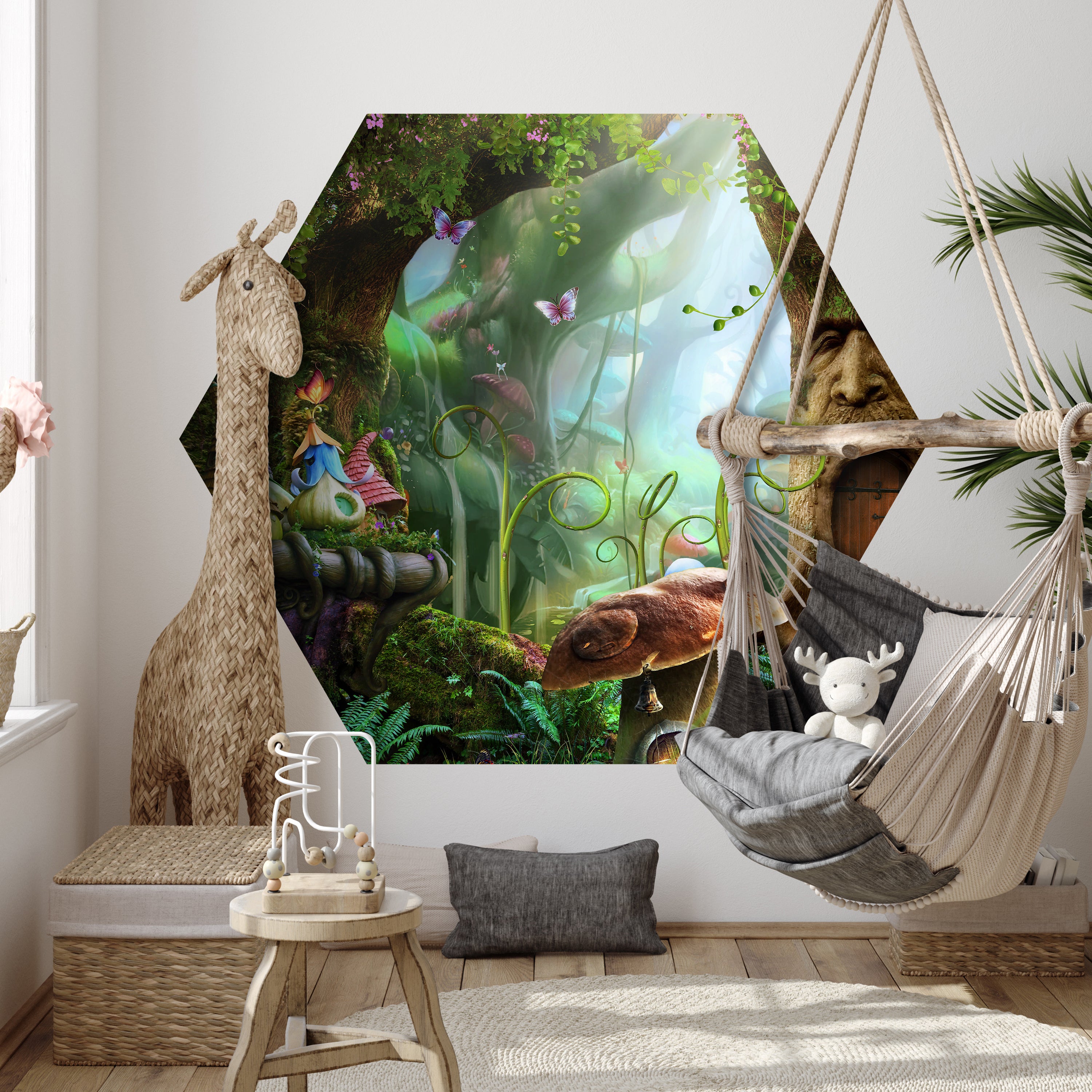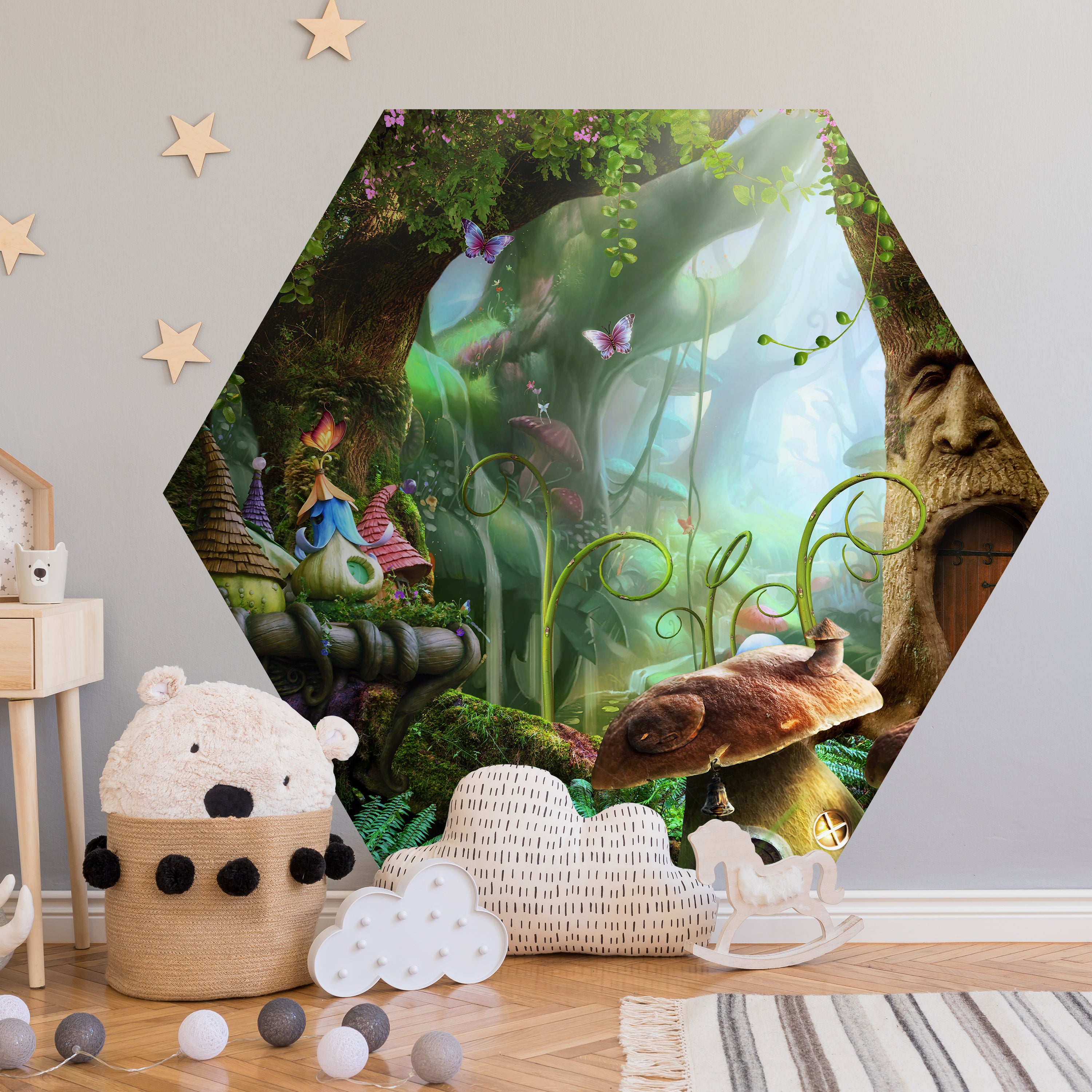 HEXAGON-FOTOTAPETE Märchenwald mit Pilzhäusern
