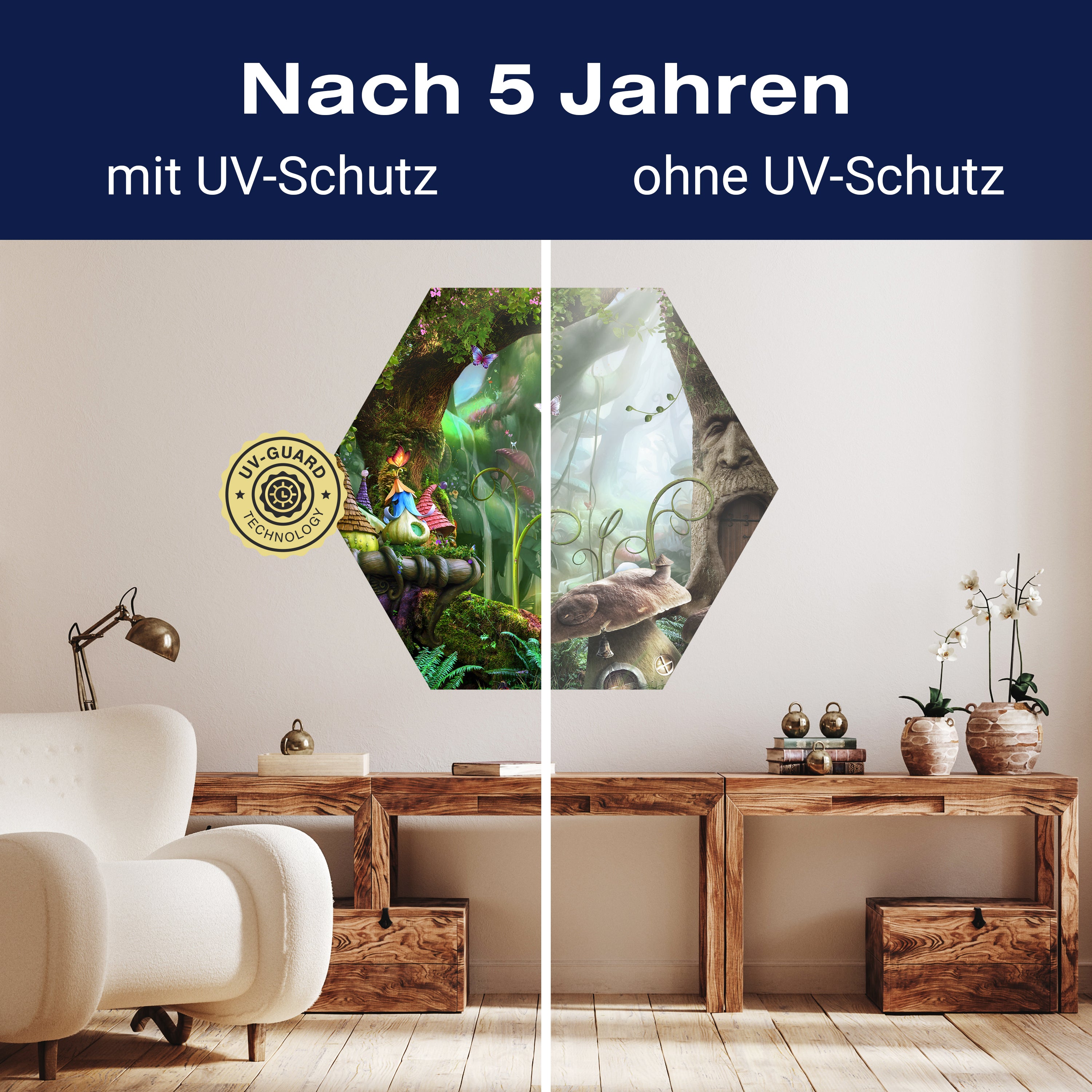 Setze auf die UV-Guard-Technologie, um deine selbstklebenden Panorama-Fototapeten nicht nur atemberaubend, sondern auch dauerhaft strahlend zu gestalten. Dieser fortschrittliche UV-Schutz sorgt dafür, dass die lebhaften Farben und scharfen Details deiner Wandgestaltung gegen die bleichende Wirkung der Sonnenstrahlen geschützt sind. Egal, wie intensiv das Sonnenlicht ist, die UV-Guard-Technologie bewahrt die Brillanz und Tiefe deiner Bilder, sodass sie jahrelang wie neu aussehen. Mach dir keine Sorgen mehr über verblassende Farben oder den Verlust von Detailreichtum. Mit dieser Technologie investierst du in die Langlebigkeit und Schönheit deiner Räume. Steige jetzt um auf UV-Guard und genieße ungetrübte Farbenpracht bei jedem Licht.