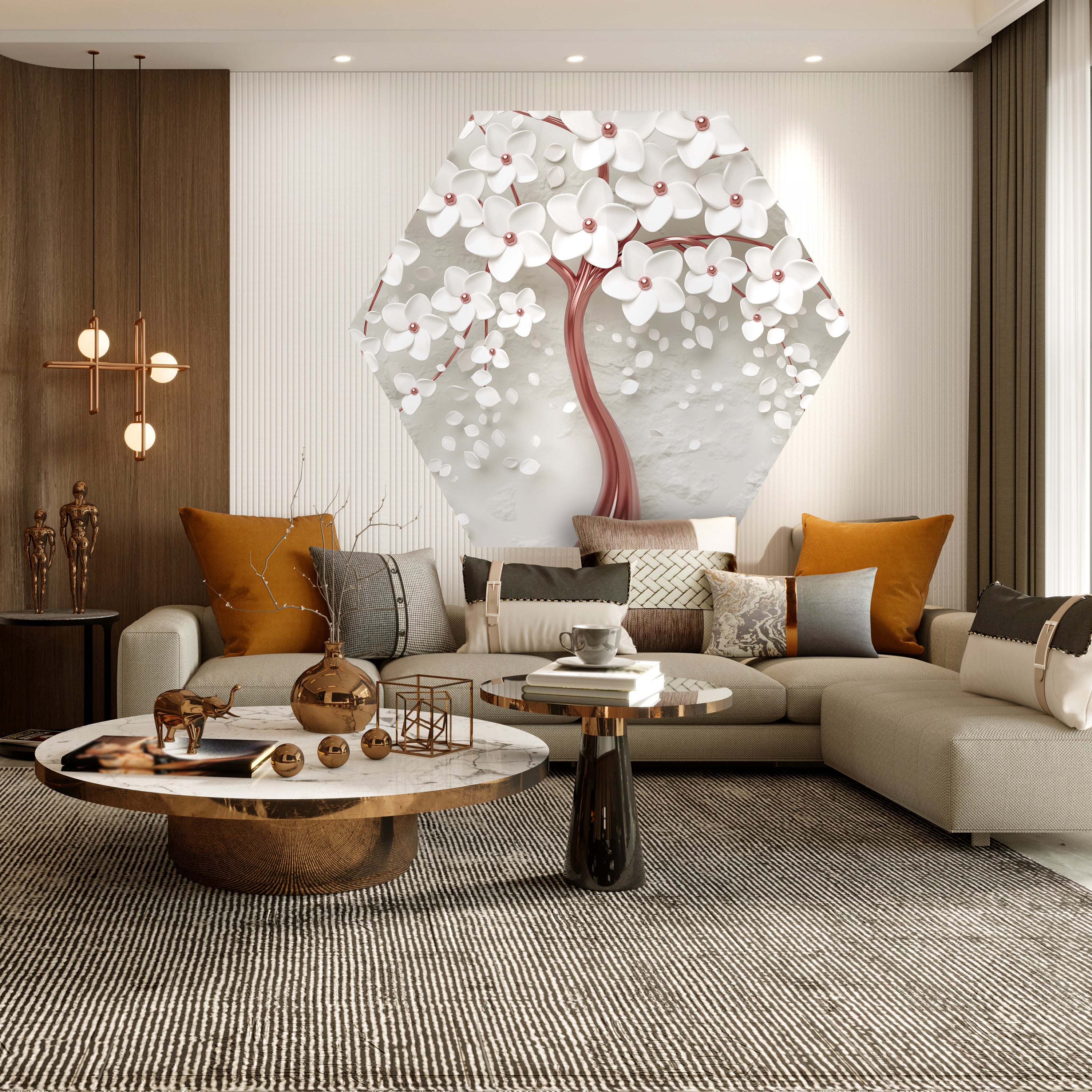 HEXAGON-FOTOTAPETE roter Baum mit Blüten