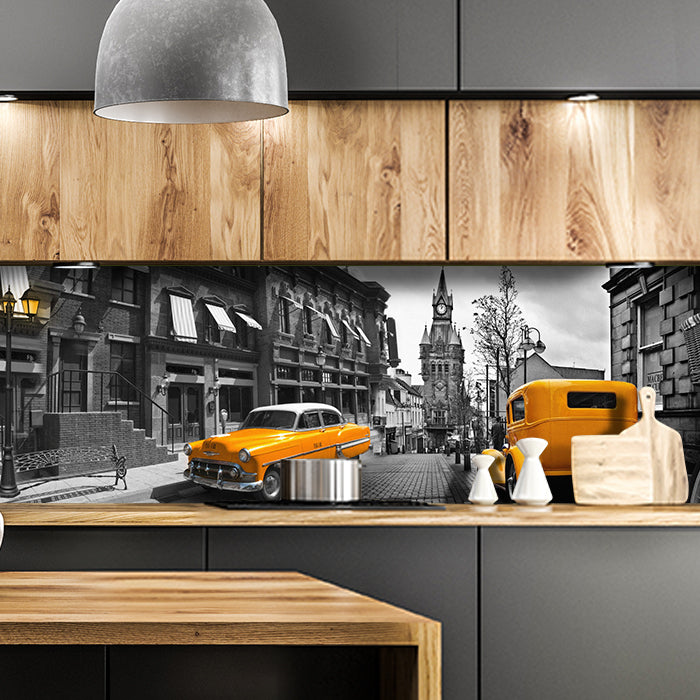 Küchenrückwand Auto Schwarz Weiß Fahrrad Laterne Gelb M1206