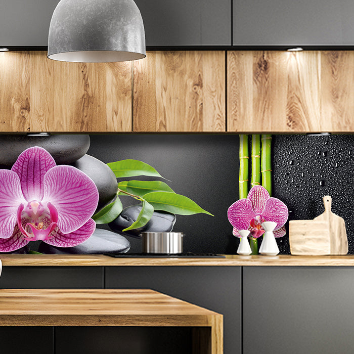 Küchenrückwand Bambus Steine Orchidee Magenta Tropfen M1184