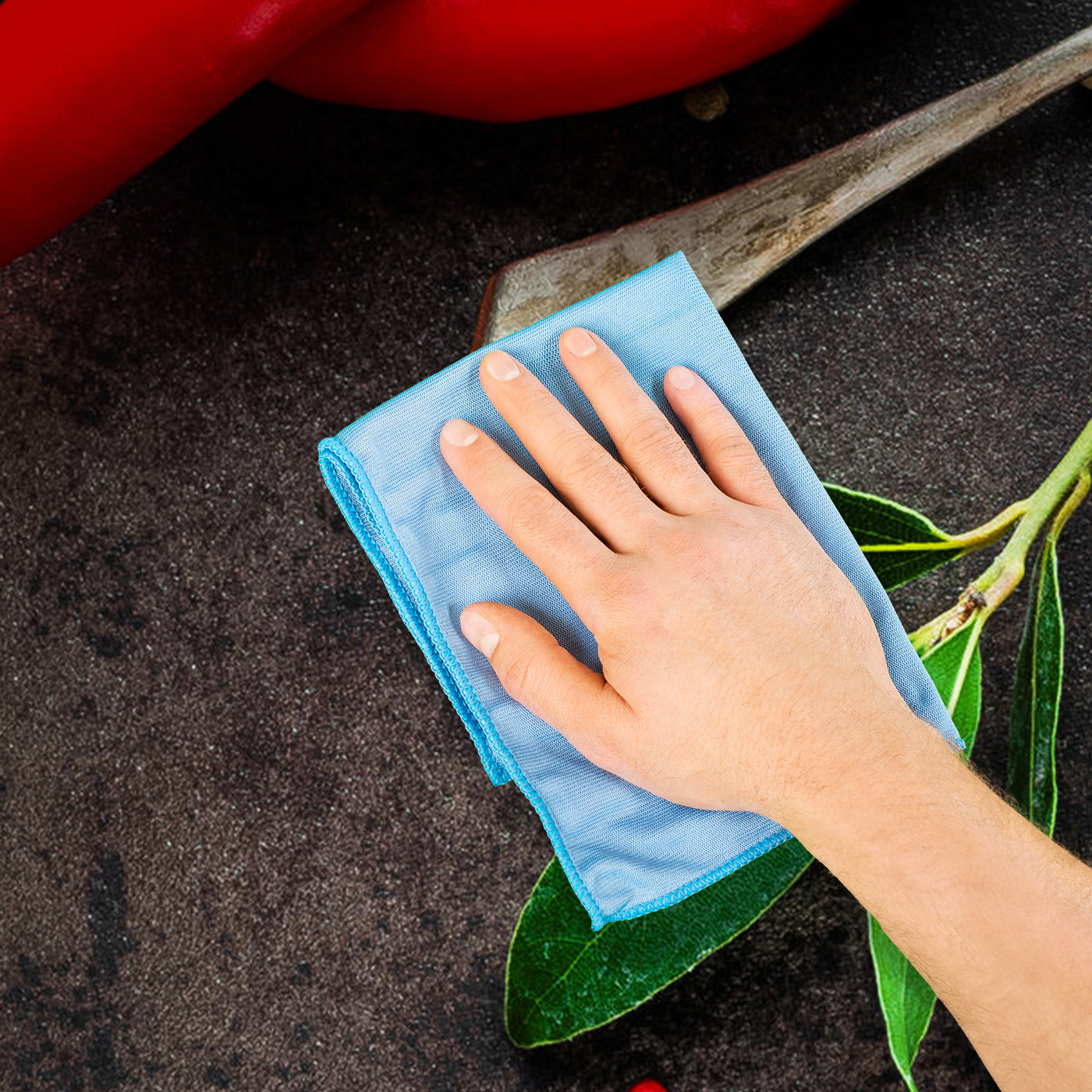 - Reinige die Oberfläche mit einem milden Reinigungsmittel oder einer Lösung aus warmem Wasser und Spülmittel.