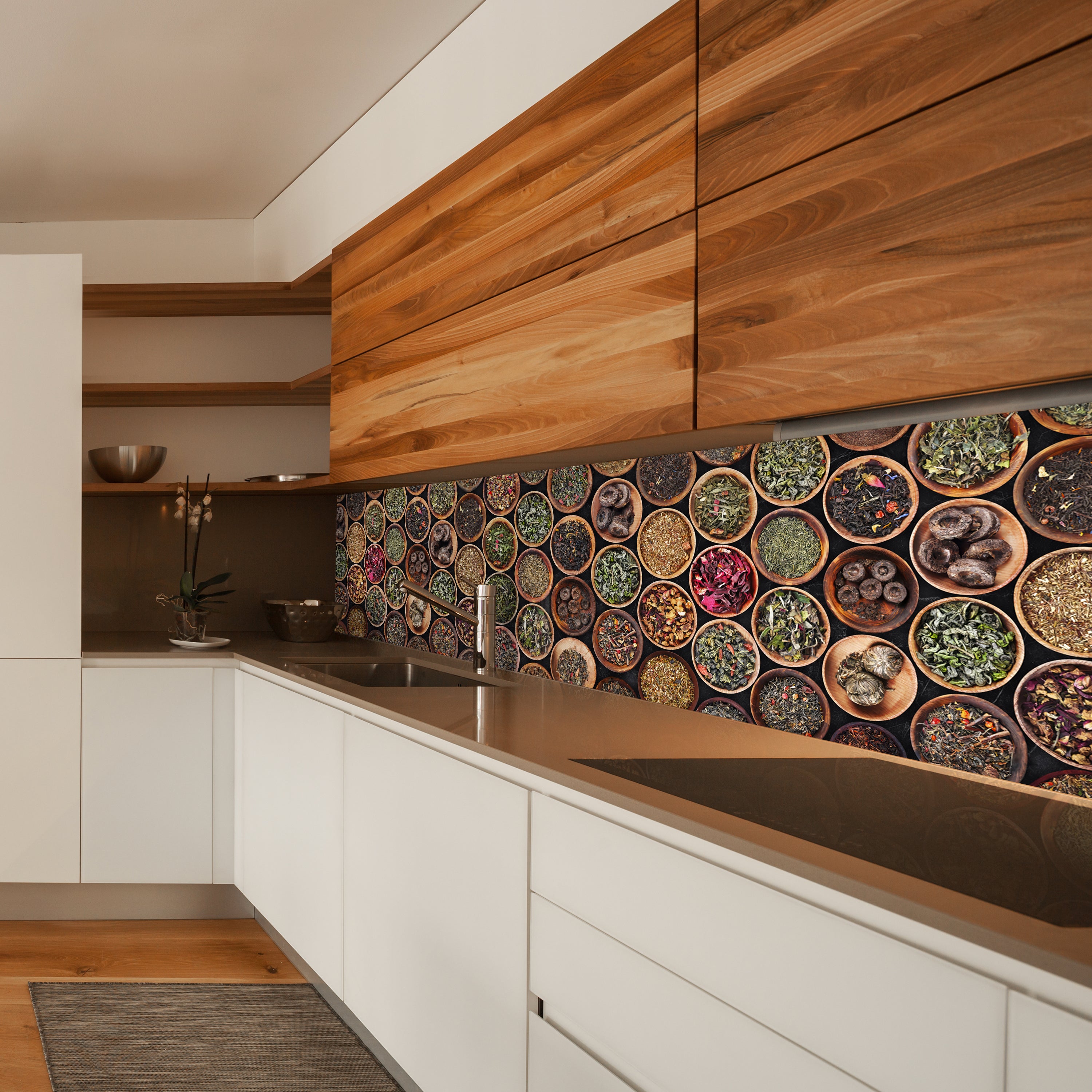 Bist Du es leid, auf die langweiligen, schwer zu reinigende Fliesen in Deiner Küche zu schauen? Stell Dir vor, wie Deine Küche mit einer stilvollen, modernen Rückwand zum Leben erwacht! Unsere Küchenrückwand 'Gewürze, Tee, Holzteller' ist nicht nur ein optisches Highlight, sondern auch praktisch und pflegeleicht.