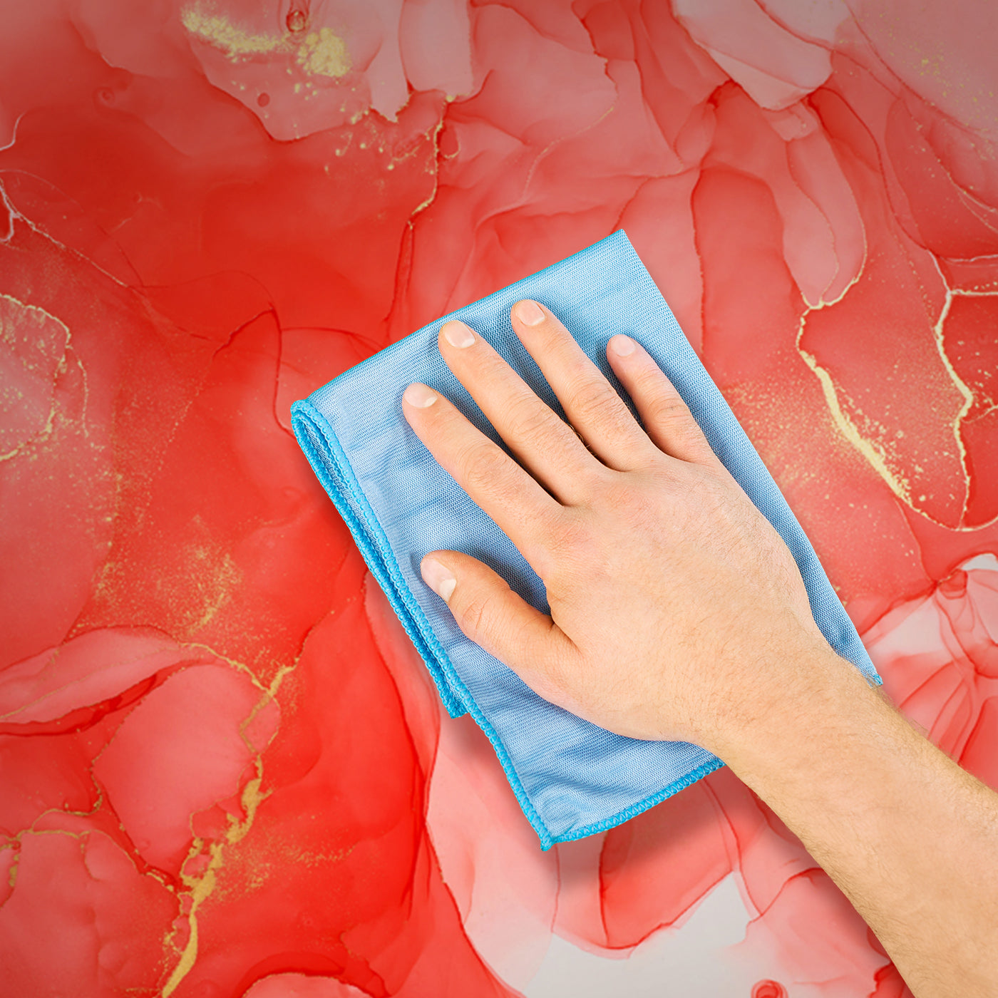 - Reinige die Oberfläche mit einem milden Reinigungsmittel oder einer Lösung aus warmem Wasser und Spülmittel.