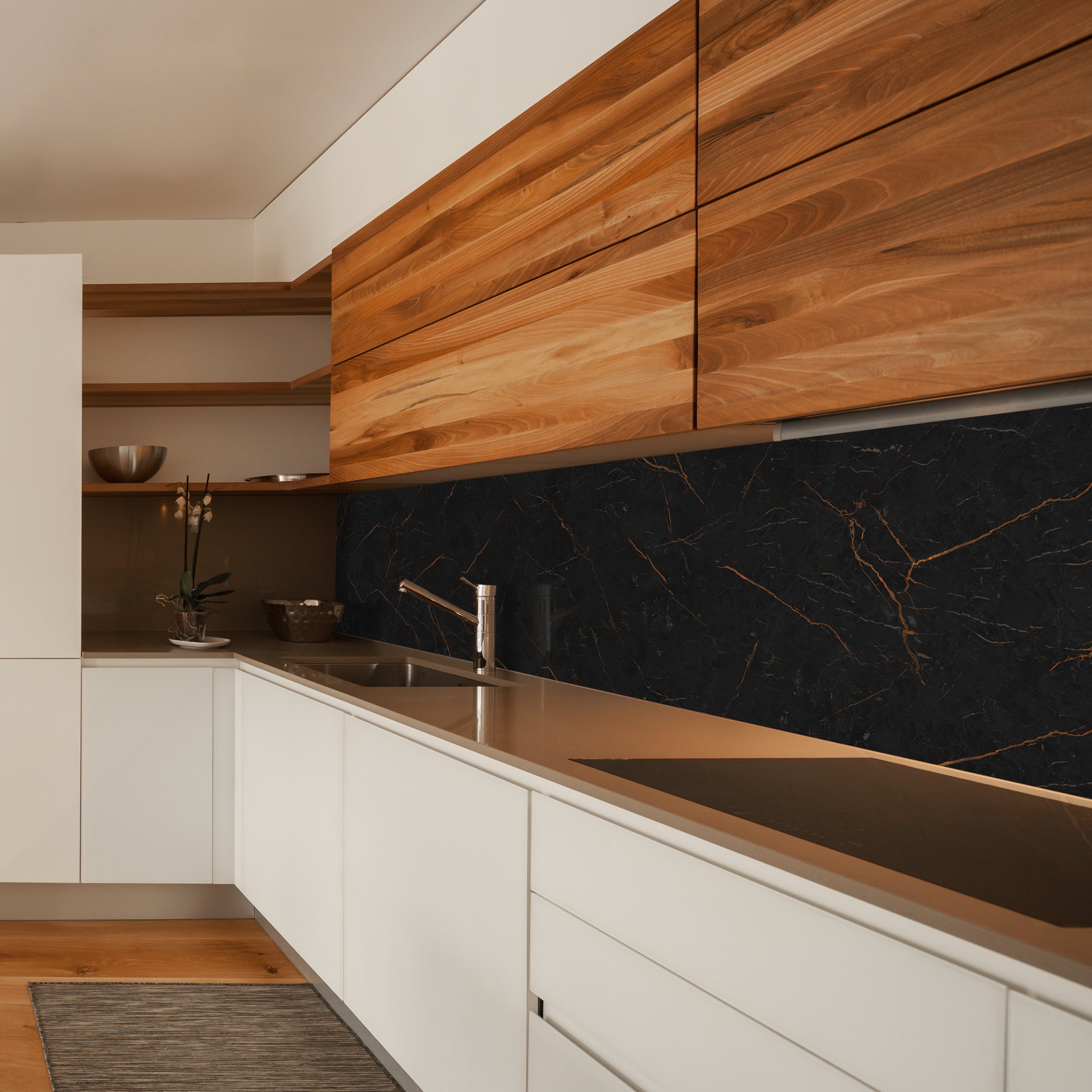 Eine Küchenrückwand oder Nischenrückwand ist ein dekoratives Element, das in der Küche verwendet wird, um den Bereich zwischen der Arbeitsplatte und den Oberschränken abzudecken. Sie dient sowohl als Schutz vor Spritzern und Flecken als auch als ästhetisches Element, um die Küche zu verschönern. Küchenrückwände werden oft aus Materialien wie Glas, Fliesen, Edelstahl, Kunststoff oder auch speziellen Fototapeten gefertigt. Sie bieten vielfältige Gestaltungsmöglichkeiten und können das Gesamtbild der Küche komplett verändern.