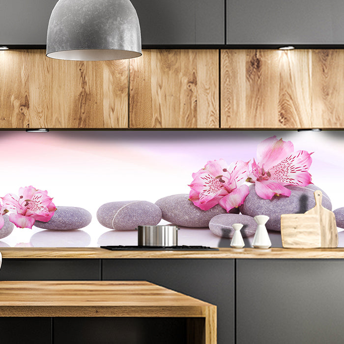 Küchenrückwand Steine Linien Spiegelung Rosa Blüten M1198