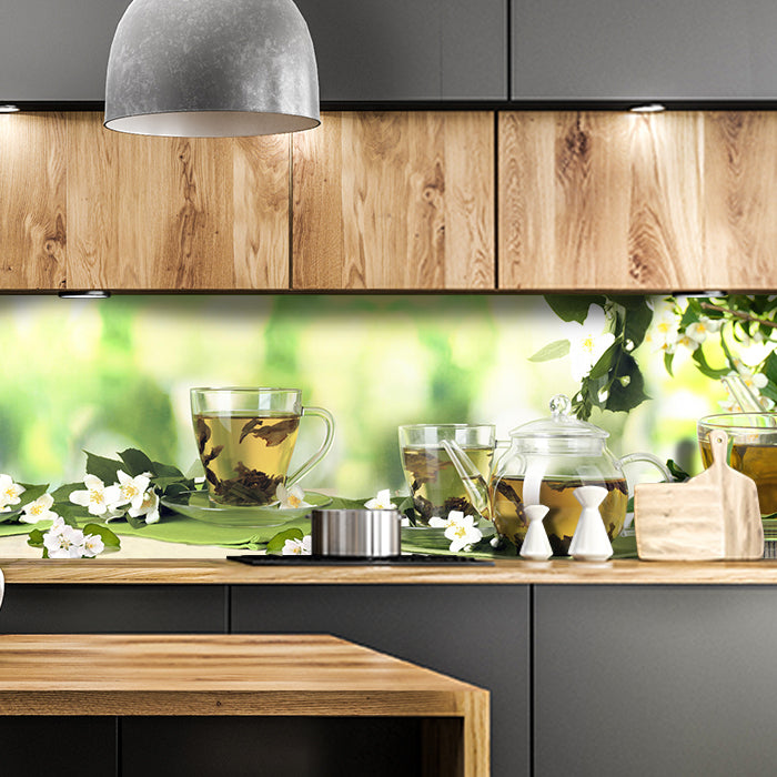 Küchenrückwand Tee Gläser Kanne Blüten Grün Blätter M1200
