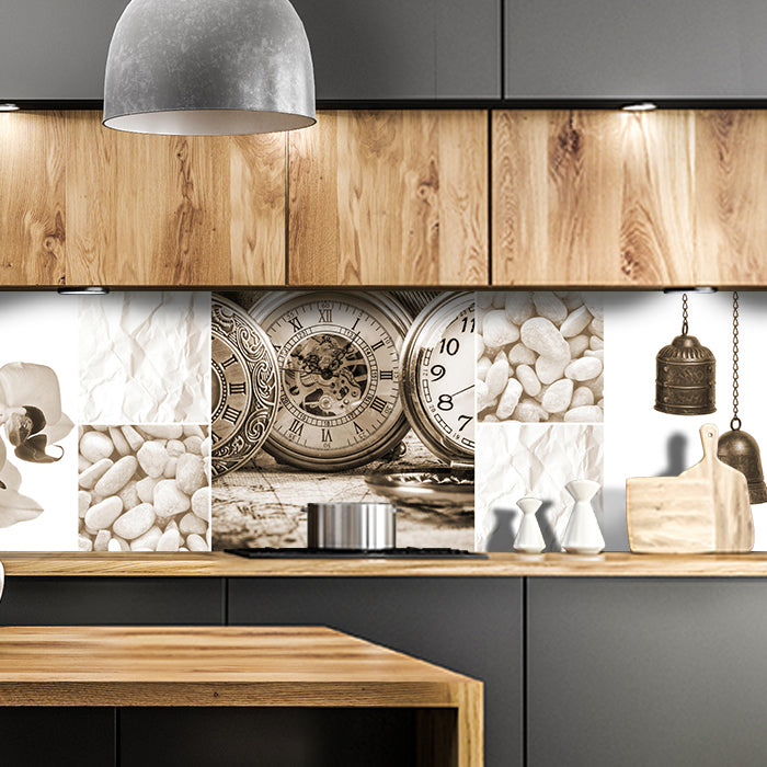 Küchenrückwand Uhren Glocken Steine Blüte Sepia Blumen M1175