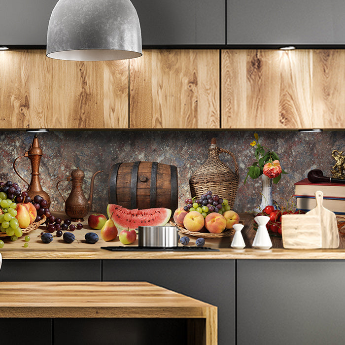 Vergiss die Tage, an denen Spritzer und Flecken Deine Küchenwand ruiniert haben. Mit der Küchenrückwand 'Wein Obst Früchte Tafel Melone Pfirsisch' gehören solche Sorgen der Vergangenheit an. Das hochwertige Material sorgt dafür, dass Deine Küchenwand gegen Wasser, Öl und andere alltägliche Missgeschicke resistent ist. Ein einfacher Wisch, und sie sieht aus wie neu – ohne den Einsatz von aggressiven Reinigungsmitteln.