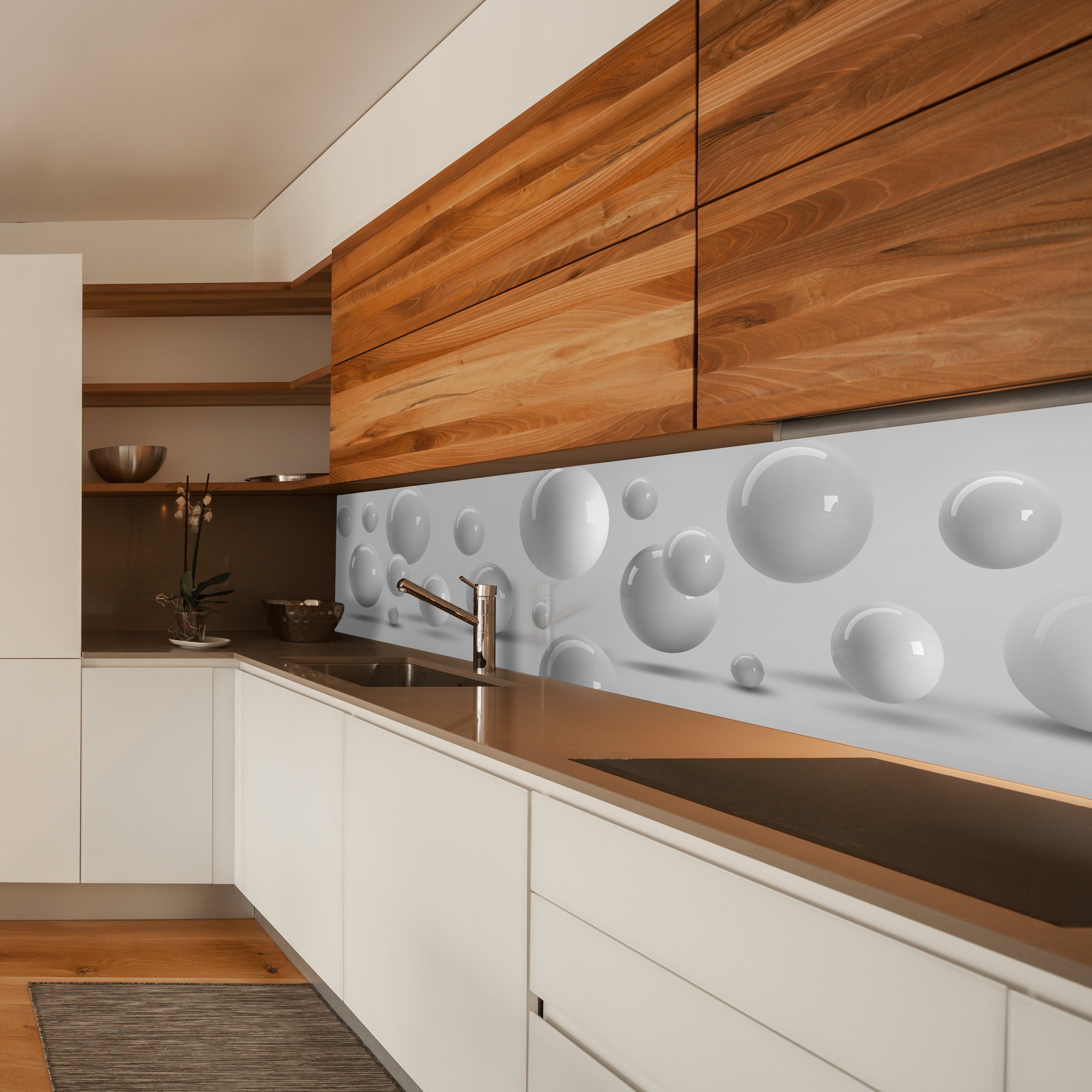 Bist Du es leid, auf die langweiligen, schwer zu reinigende Fliesen in Deiner Küche zu schauen? Stell Dir vor, wie Deine Küche mit einer stilvollen, modernen Rückwand zum Leben erwacht! Unsere Küchenrückwand 'weiße Kugeln' ist nicht nur ein optisches Highlight, sondern auch praktisch und pflegeleicht.