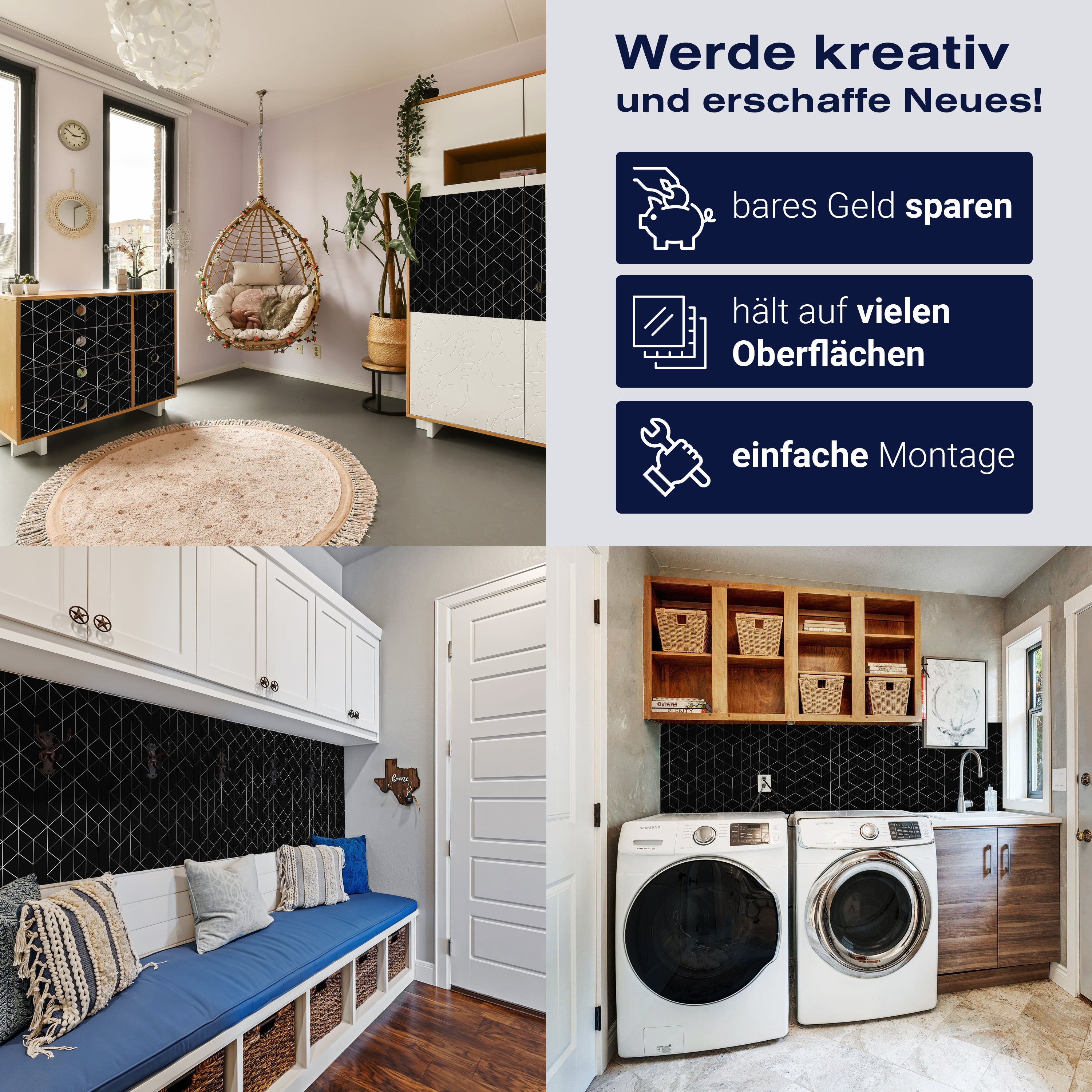 - Selbstklebendes Vlies 150g/m²: Einfach anzubringen, perfekt für Mietwohnungen.