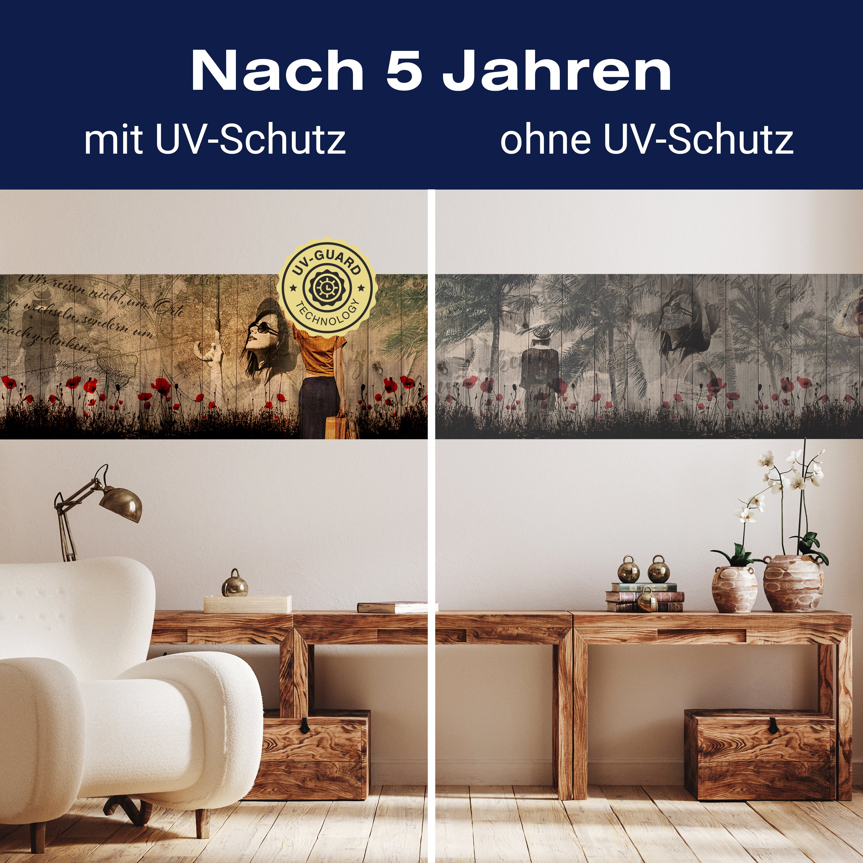 Setze auf die UV-Guard-Technologie, um deine selbstklebenden Panorama-Fototapeten nicht nur atemberaubend, sondern auch dauerhaft strahlend zu gestalten. Dieser fortschrittliche UV-Schutz sorgt dafür, dass die lebhaften Farben und scharfen Details deiner Wandgestaltung gegen die bleichende Wirkung der Sonnenstrahlen geschützt sind. Egal, wie intensiv das Sonnenlicht ist, die UV-Guard-Technologie bewahrt die Brillanz und Tiefe deiner Bilder, sodass sie jahrelang wie neu aussehen. Mach dir keine Sorgen mehr über verblassende Farben oder den Verlust von Detailreichtum. Mit dieser Technologie investierst du in die Langlebigkeit und Schönheit deiner Räume. Steige jetzt um auf UV-Guard und genieße ungetrübte Farbenpracht bei jedem Licht.