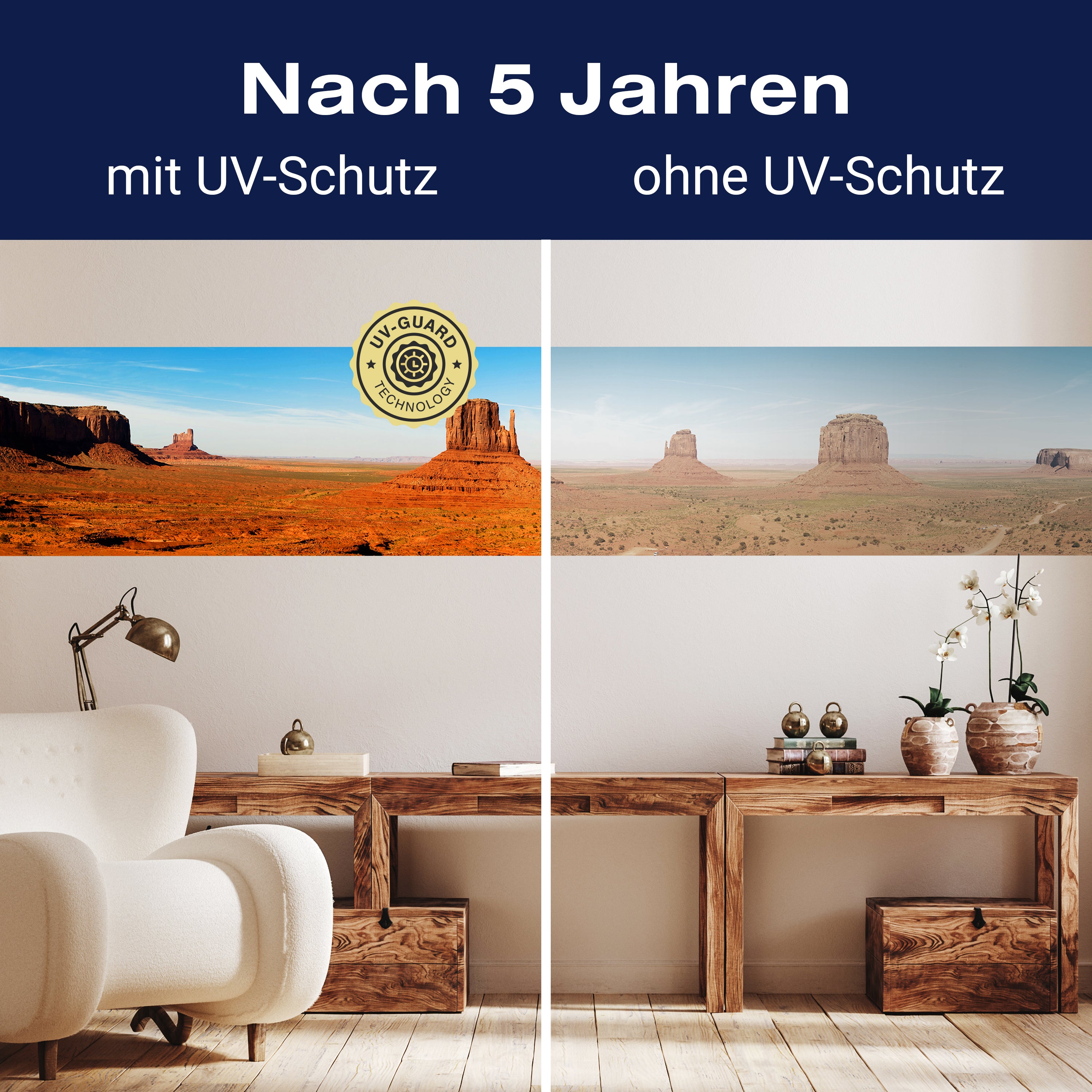 Setze auf die UV-Guard-Technologie, um deine selbstklebenden Panorama-Fototapeten nicht nur atemberaubend, sondern auch dauerhaft strahlend zu gestalten. Dieser fortschrittliche UV-Schutz sorgt dafür, dass die lebhaften Farben und scharfen Details deiner Wandgestaltung gegen die bleichende Wirkung der Sonnenstrahlen geschützt sind. Egal, wie intensiv das Sonnenlicht ist, die UV-Guard-Technologie bewahrt die Brillanz und Tiefe deiner Bilder, sodass sie jahrelang wie neu aussehen. Mach dir keine Sorgen mehr über verblassende Farben oder den Verlust von Detailreichtum. Mit dieser Technologie investierst du in die Langlebigkeit und Schönheit deiner Räume. Steige jetzt um auf UV-Guard und genieße ungetrübte Farbenpracht bei jedem Licht.