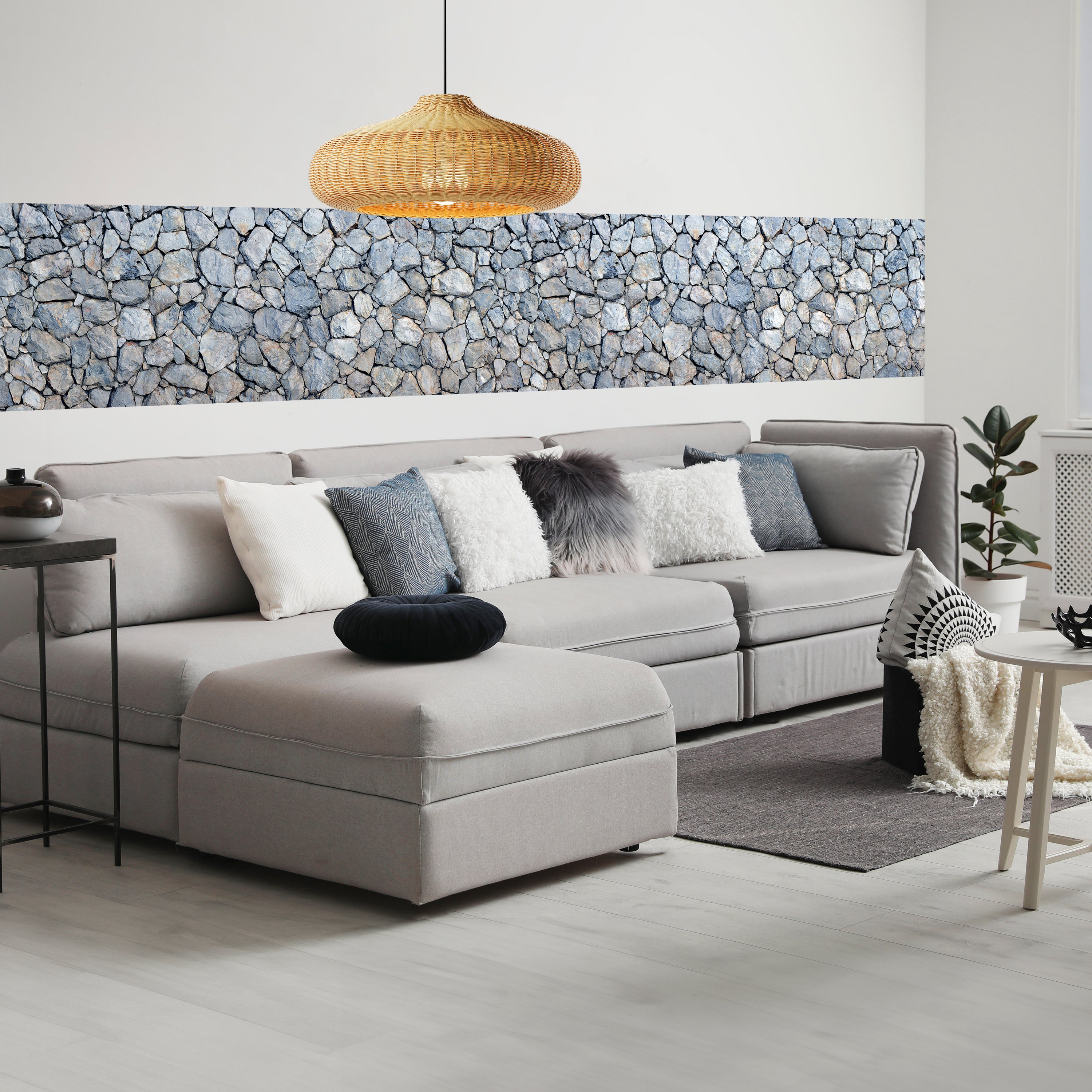 - Arbeite dich entlang der Wand vor und setze die nächste Bahn der selbstklebenden Strukturtapete nahtlos an. Achte darauf, dass die Muster oder Designs sauber ineinander übergehen.