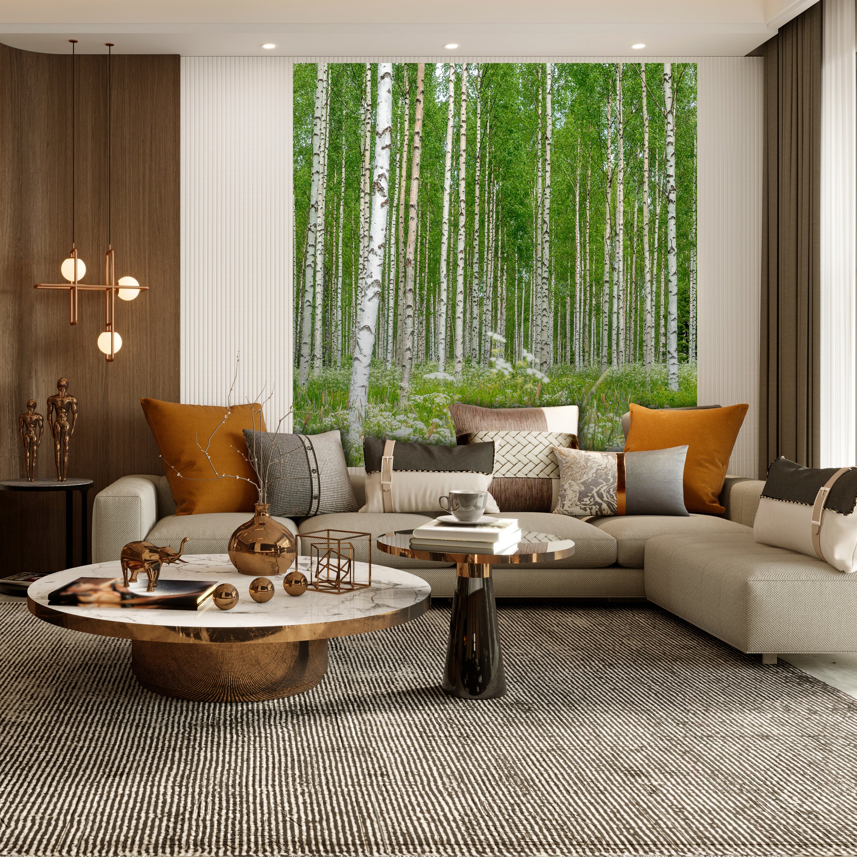 QUADRATISCHE FOTOTAPETE Birkenwald mit Blumenwiese