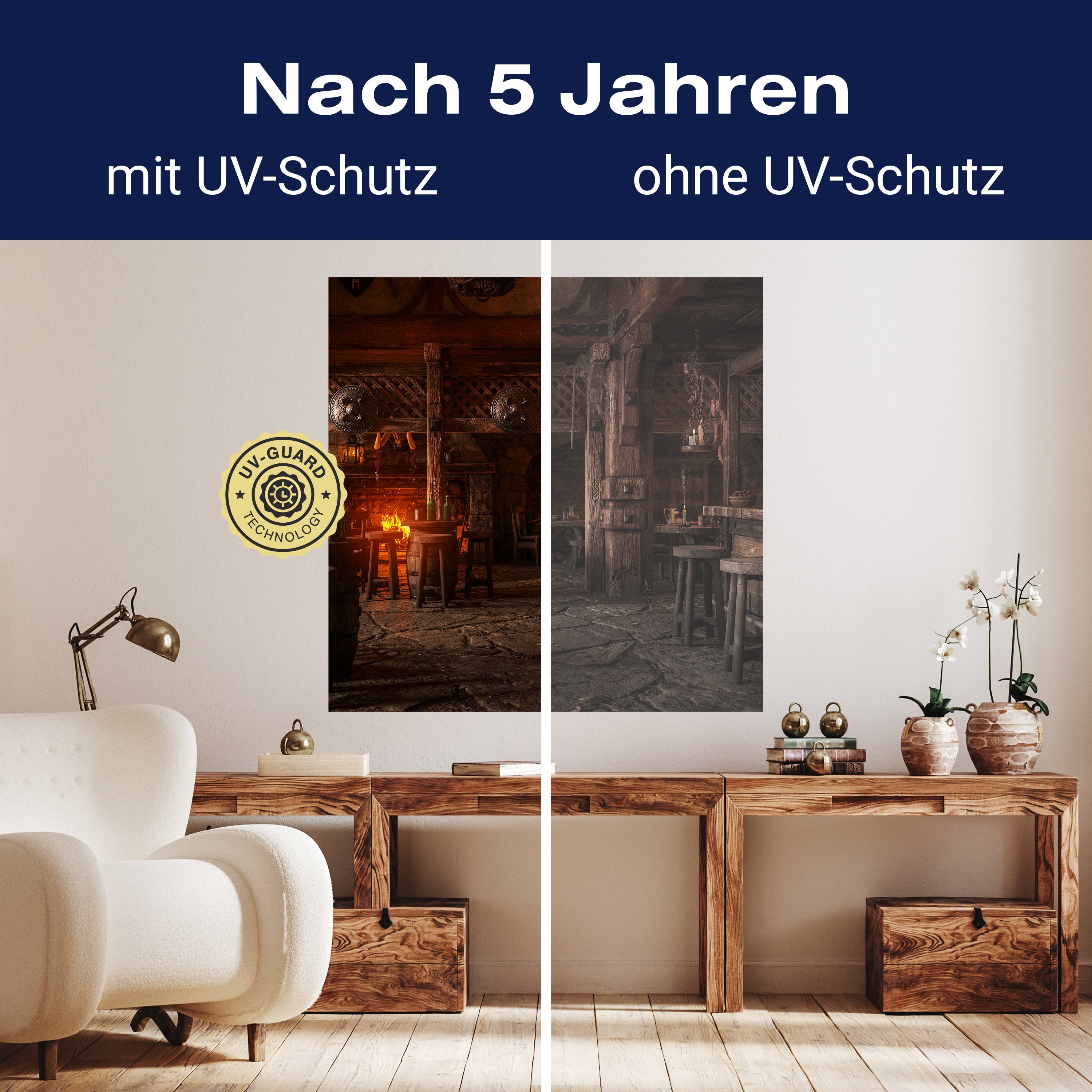 Setze auf die UV-Guard-Technologie, um deine selbstklebenden Panorama-Fototapeten nicht nur atemberaubend, sondern auch dauerhaft strahlend zu gestalten. Dieser fortschrittliche UV-Schutz sorgt dafür, dass die lebhaften Farben und scharfen Details deiner Wandgestaltung gegen die bleichende Wirkung der Sonnenstrahlen geschützt sind. Egal, wie intensiv das Sonnenlicht ist, die UV-Guard-Technologie bewahrt die Brillanz und Tiefe deiner Bilder, sodass sie jahrelang wie neu aussehen. Mach dir keine Sorgen mehr über verblassende Farben oder den Verlust von Detailreichtum. Mit dieser Technologie investierst du in die Langlebigkeit und Schönheit deiner Räume. Steige jetzt um auf UV-Guard und genieße ungetrübte Farbenpracht bei jedem Licht.