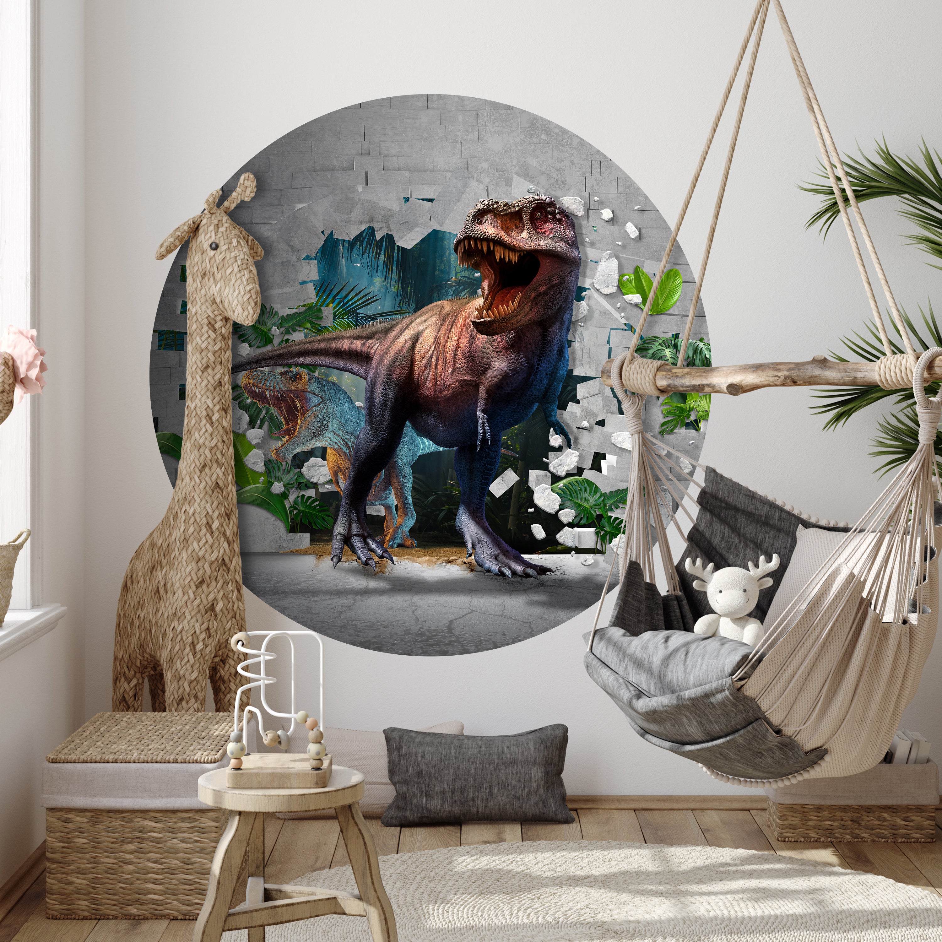 Träumst Du davon, Deine Wände in eine beeindruckende Kunstgalerie zu verwandeln? Mit unserer hochwertigen, runden Fototapete Wanddurchbruch mit Dinosauriern M0038 ist es jetzt möglich! Jede Wand wird zu einer Leinwand Deiner Kreativität.