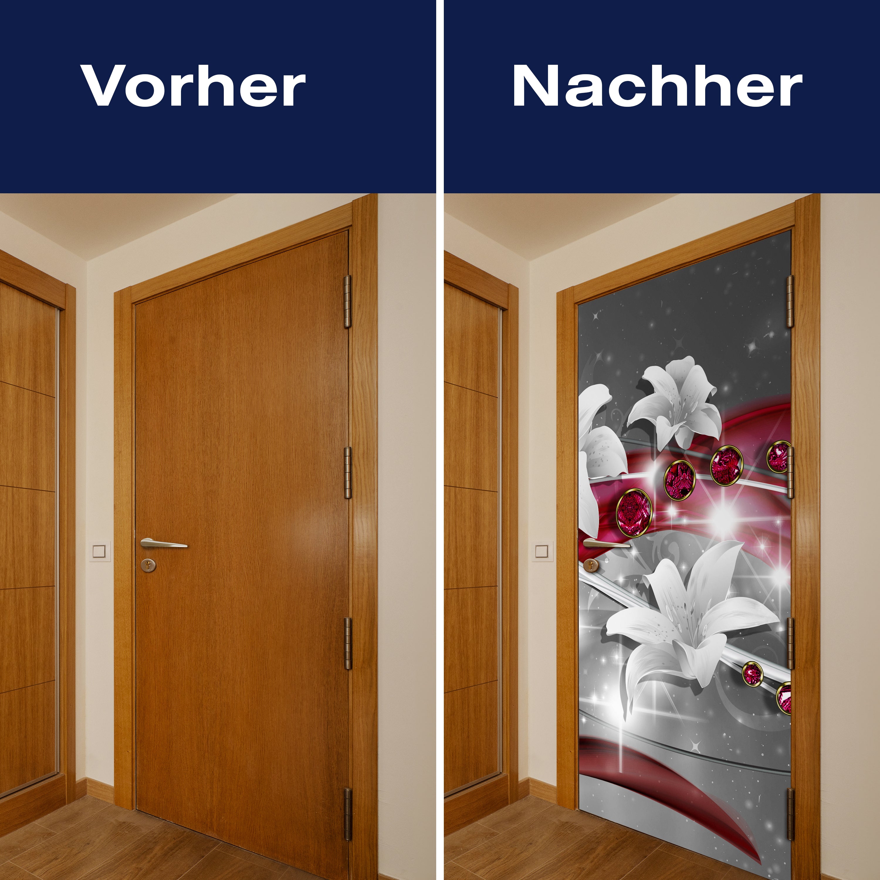 Mit unserer Türtapete verwandelst du jede gewöhnliche Tür in ein Kunstwerk. Ob du die Atmosphäre deines Wohnraums aufwerten oder deinem Haus einen neuen Charakter verleihen möchtest, unsere Türtapeten bieten eine einzigartige Möglichkeit, Veränderung zu gestalten. Lass dich von der Einfachheit der Anwendung begeistern und erlebe, wie deine Räume durch die Kraft des Designs und der Farbe transformiert werden.