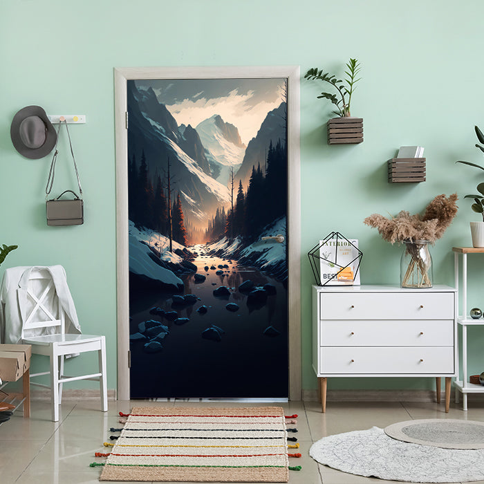 Entdecke die Türtapete Berge, Bach, Winter, Wald