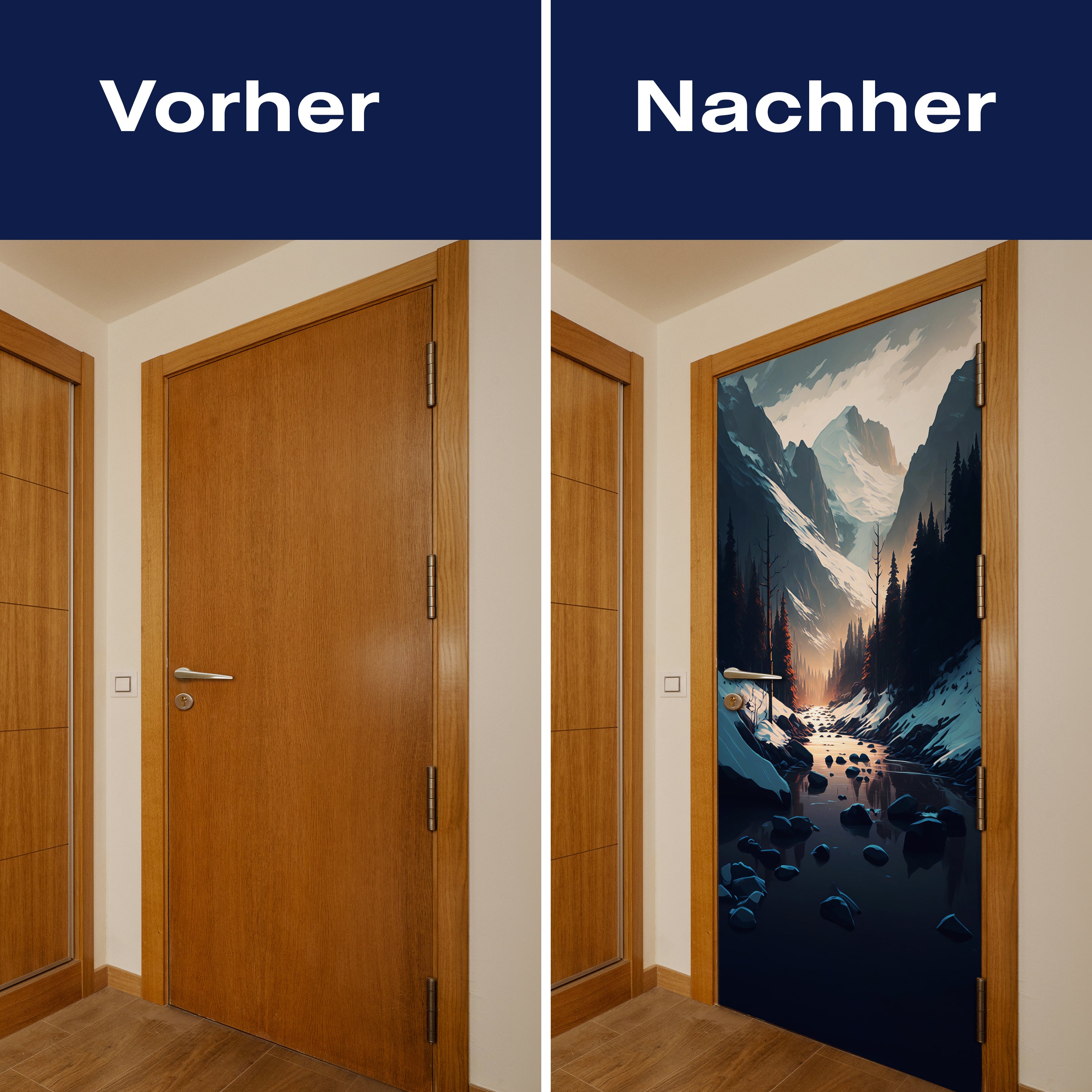 Hast du jemals darüber nachgedacht, wie eine einfache Veränderung deinen Wohnraum komplett umgestalten kann? Die Türtapete Berge, Bach, Winter, Wald von Wandmotiv24 ist genau das, was du brauchst, um deinem Zuhause einen Hauch von Einzigartigkeit und Stil zu verleihen. Dieses einzigartige Design erzielt eine atemberaubende visuelle Wirkung, die jeden Betrachter in den Bann zieht.