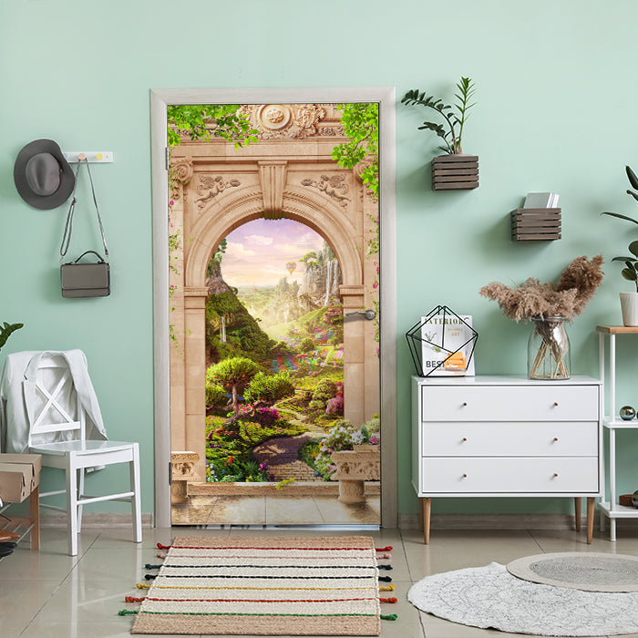Entdecke die Türtapete Blick auf Felder durch Torbogen, Ballon