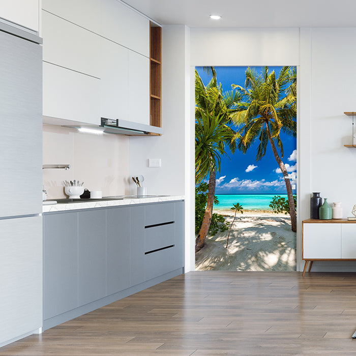Entdecke die Türtapete Blick aufs Meer, Palmen, Paradies, Sand