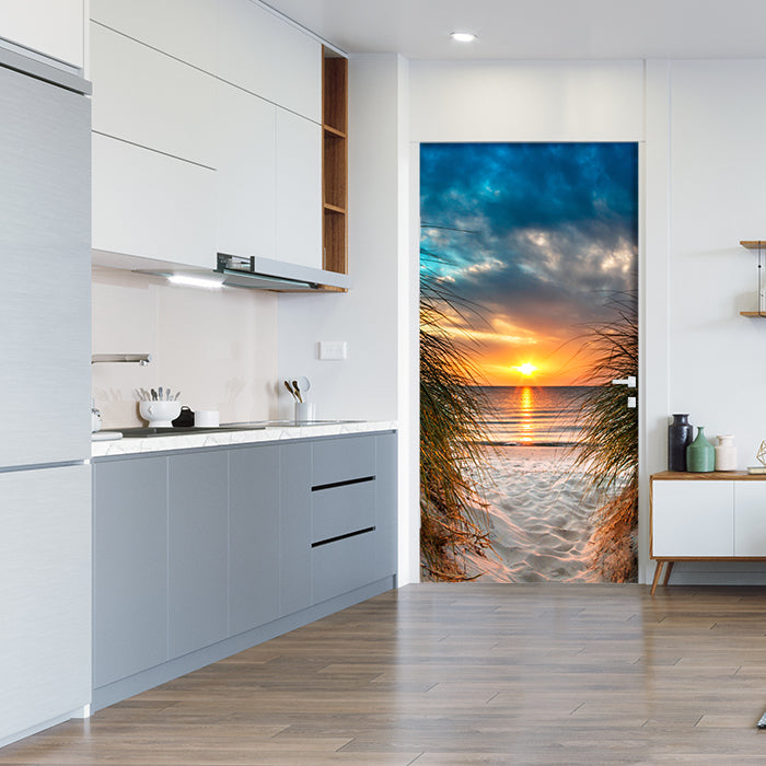 Entdecke die Türtapete Blick durch Düne, Meer, Sonnenuntergang