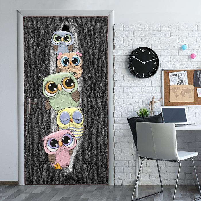 Entdecke die Türtapete Comic Eulen im Baum-stamm, Natur, Vögel