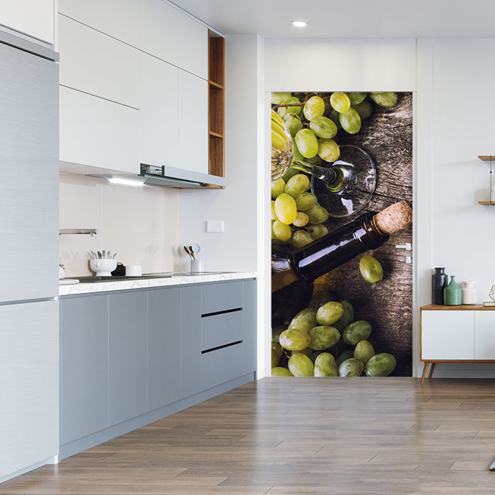 Entdecke die Türtapete Flasche Weißwein und Trauben auf einem alten Tisch