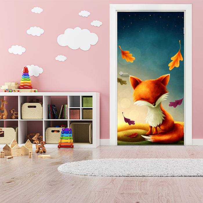 Entdecke die Türtapete Fuchs im Herbst, Blätter, Sterne, Himmel