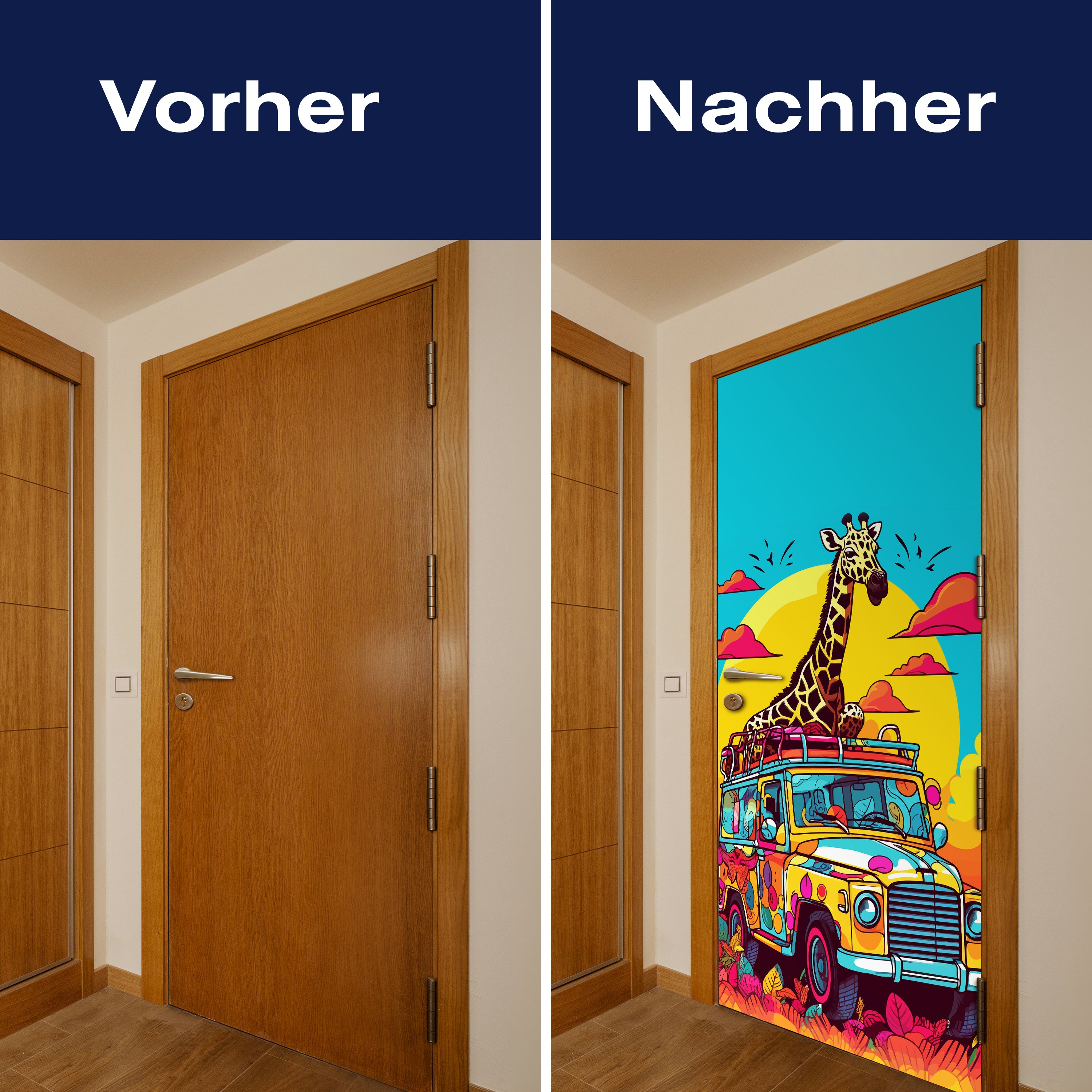Hast du jemals darüber nachgedacht, wie eine einfache Veränderung deinen Wohnraum komplett umgestalten kann? Die Türtapete Giraffe, Jeep, Safari, Illustration von Wandmotiv24 ist genau das, was du brauchst, um deinem Zuhause einen Hauch von Einzigartigkeit und Stil zu verleihen. Dieses einzigartige Design erzielt eine atemberaubende visuelle Wirkung, die jeden Betrachter in den Bann zieht.