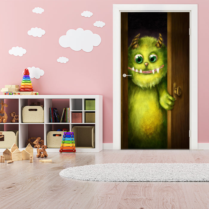 Entdecke die Türtapete grünes Monster in der Tür, Hörner, Zähne