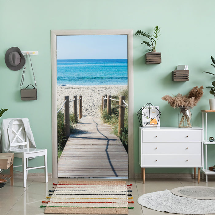 Entdecke die Türtapete Holzweg zum Strand, Meer, Holz, Seil