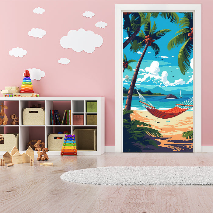 Entdecke die Türtapete Illustration, Hängematte, Strand, Palmen