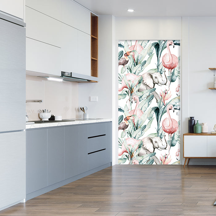 Entdecke die Türtapete Muster Elefanten & Flamingos, Tropisch