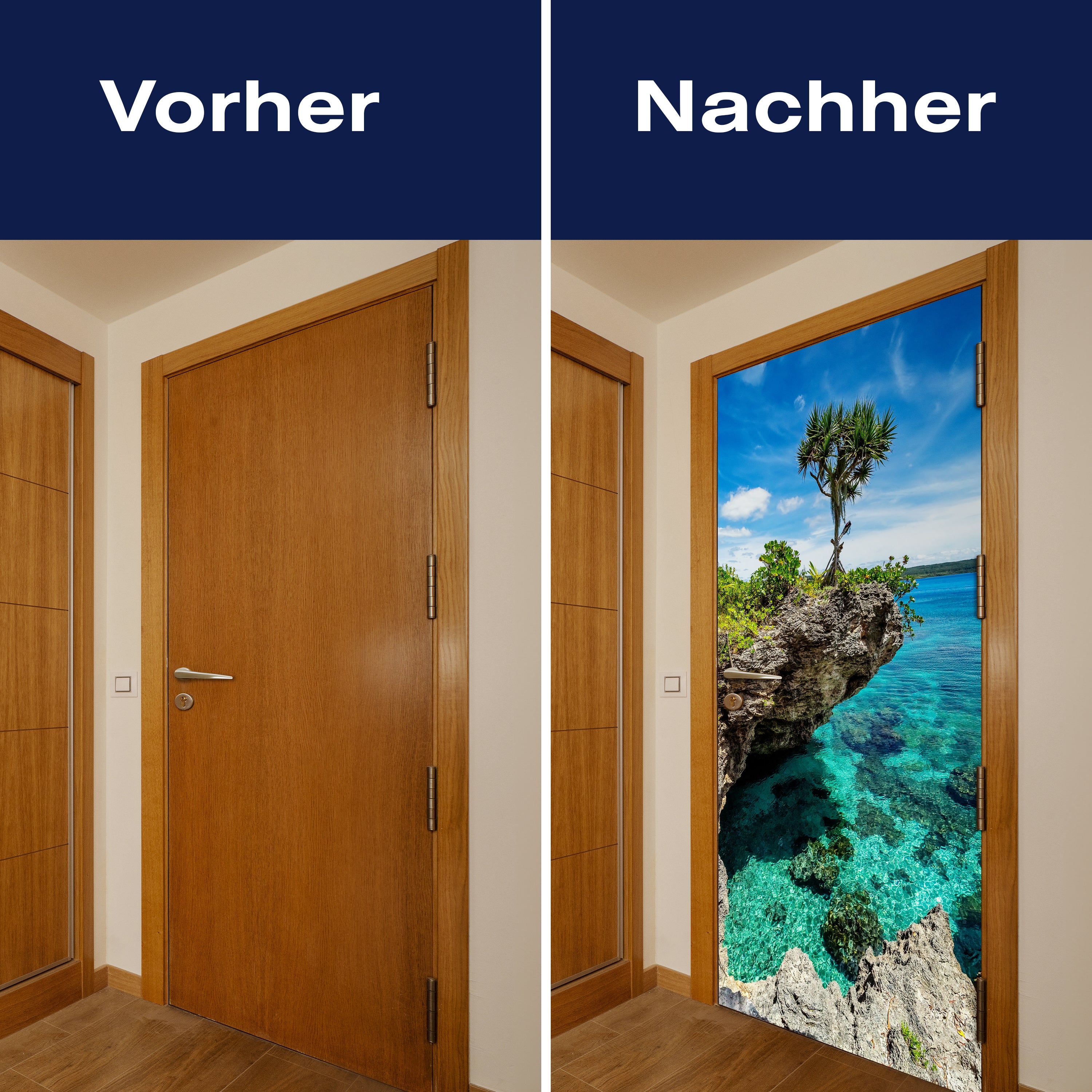 Hast du jemals darüber nachgedacht, wie eine einfache Veränderung deinen Wohnraum komplett umgestalten kann? Die Türtapete Palme auf Fels-klippe, Meer, Ozean von Wandmotiv24 ist genau das, was du brauchst, um deinem Zuhause einen Hauch von Einzigartigkeit und Stil zu verleihen. Dieses einzigartige Design erzielt eine atemberaubende visuelle Wirkung, die jeden Betrachter in den Bann zieht.