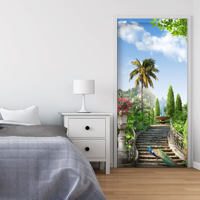 Entdecke die Türtapete Pfau auf Treppe, Palmen, Springbrunnen