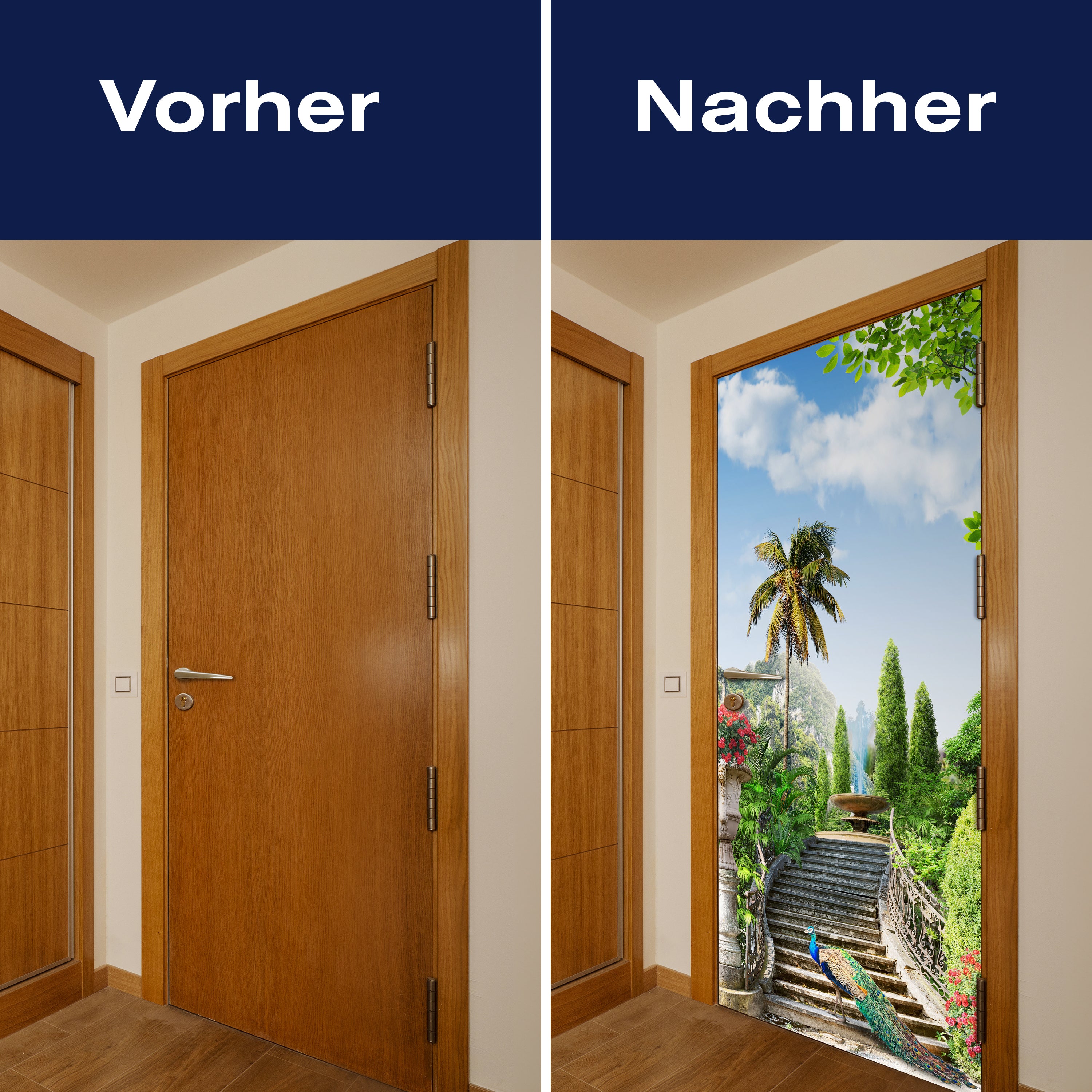 Hast du jemals darüber nachgedacht, wie eine einfache Veränderung deinen Wohnraum komplett umgestalten kann? Die Türtapete Pfau auf Treppe, Palmen, Springbrunnen von Wandmotiv24 ist genau das, was du brauchst, um deinem Zuhause einen Hauch von Einzigartigkeit und Stil zu verleihen. Dieses einzigartige Design erzielt eine atemberaubende visuelle Wirkung, die jeden Betrachter in den Bann zieht.
