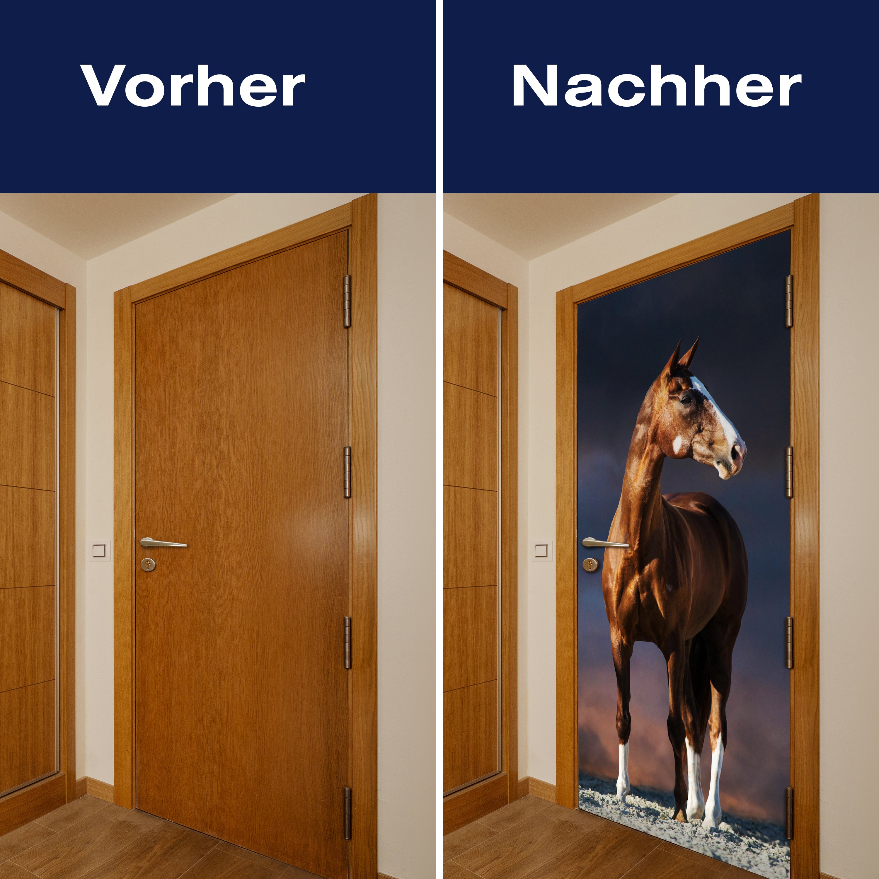 Hast du jemals darüber nachgedacht, wie eine einfache Veränderung deinen Wohnraum komplett umgestalten kann? Die Türtapete Pferd auf Pfad, dunkle Wolken, Tiere von Wandmotiv24 ist genau das, was du brauchst, um deinem Zuhause einen Hauch von Einzigartigkeit und Stil zu verleihen. Dieses einzigartige Design erzielt eine atemberaubende visuelle Wirkung, die jeden Betrachter in den Bann zieht.