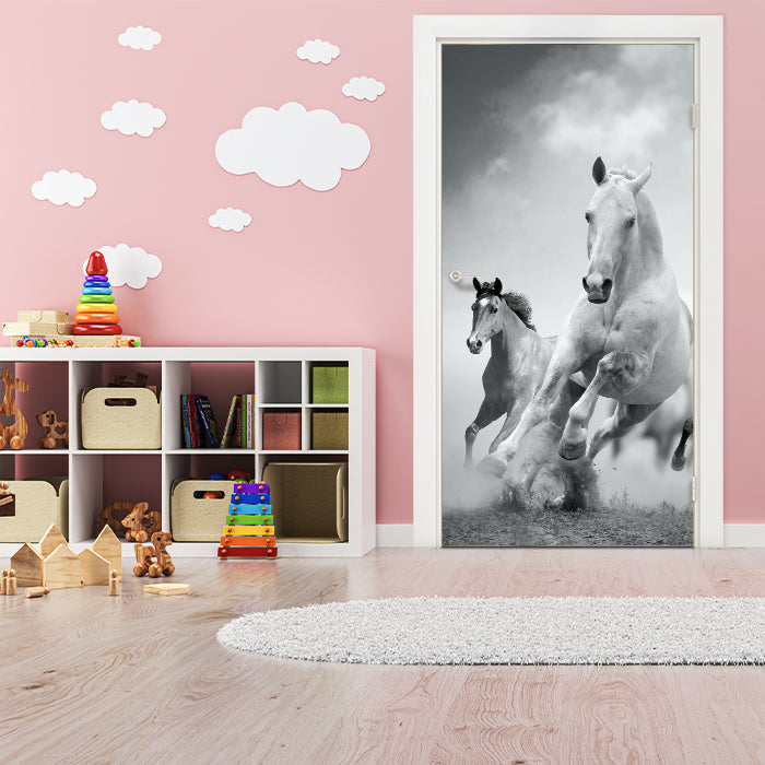 Entdecke die Türtapete Pferde laufen in Weiß und Schwarz
